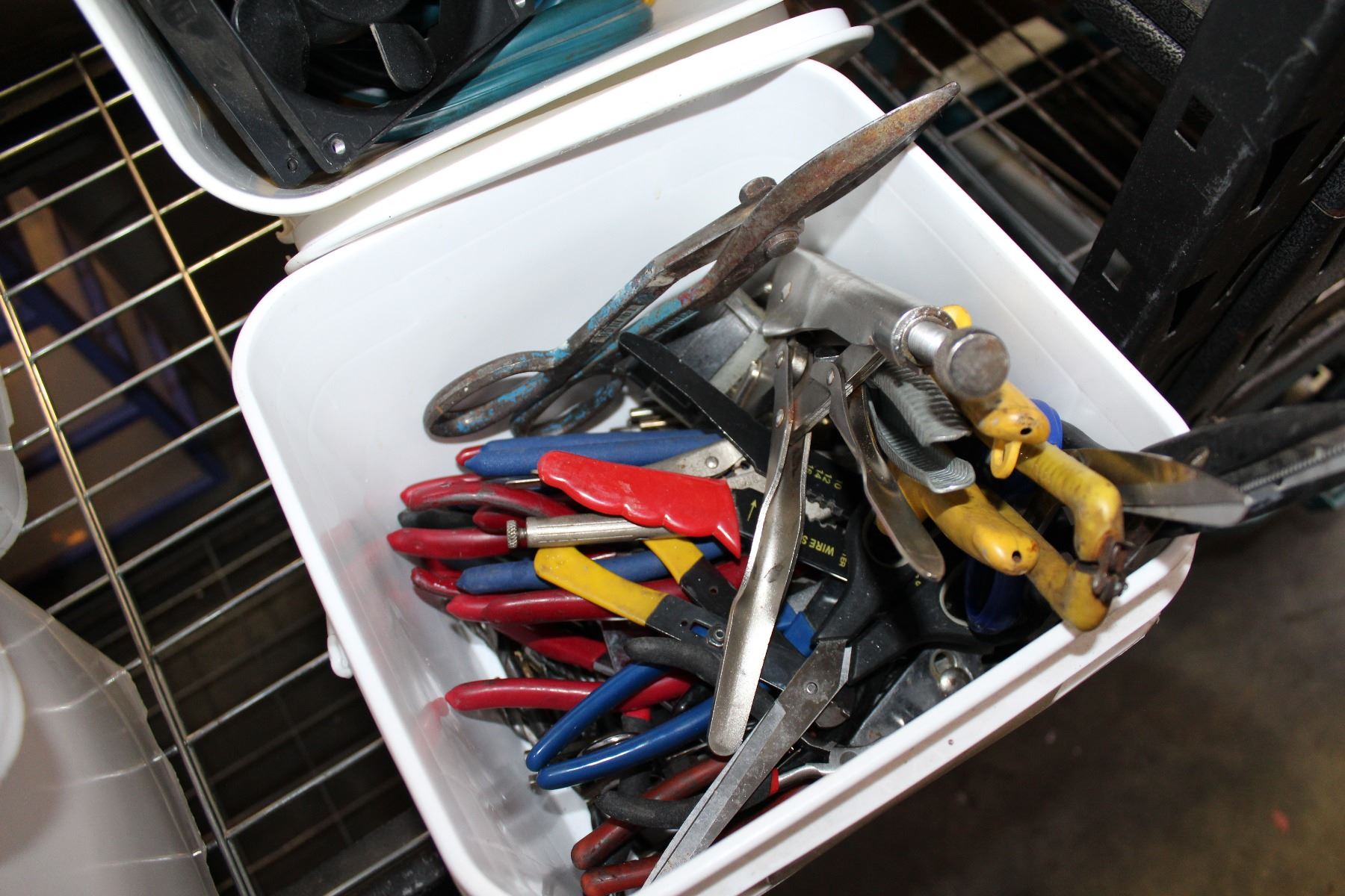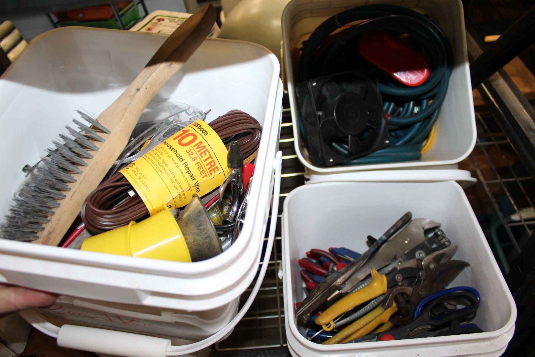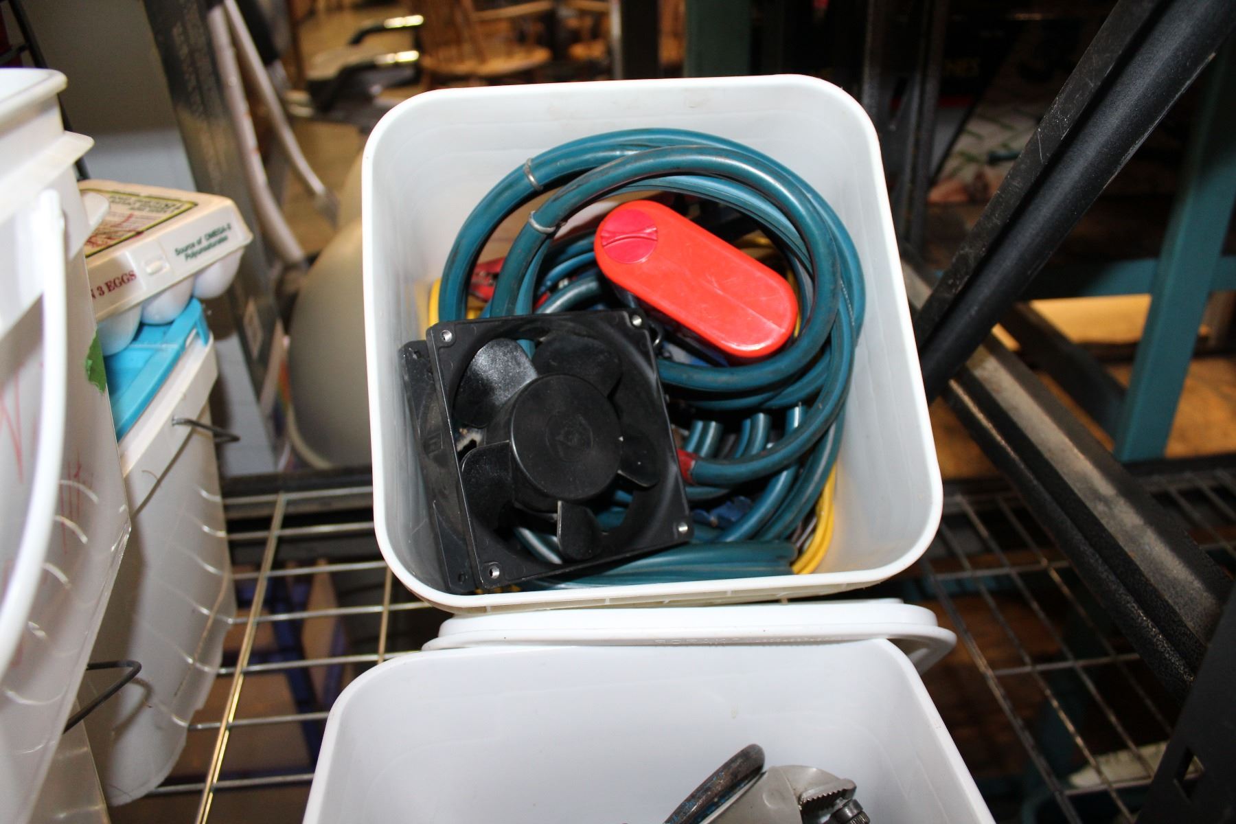 THREE BINS OF HAND TOOLS AND JUMPER CABLES