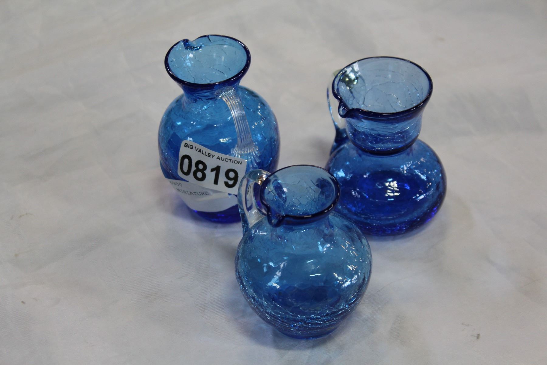 THREE BLUE ART GLASS MINIATURE PITCHERS