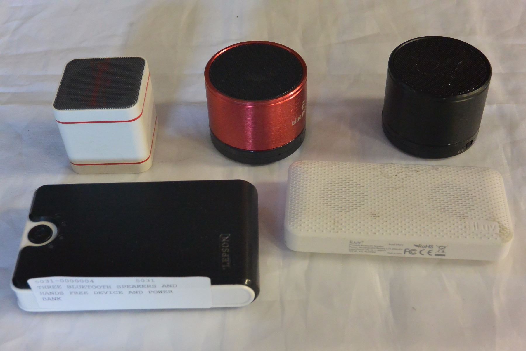 THREE BLUETOOTH SPEAKERS AND HANDS FREE DEVICE AND POWER BANK