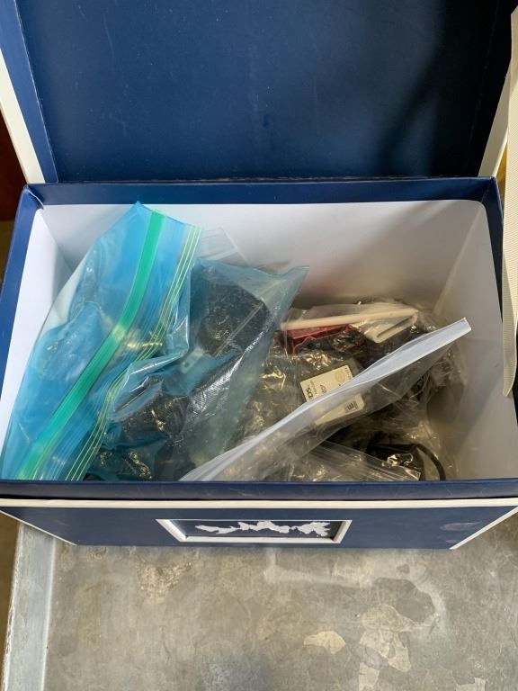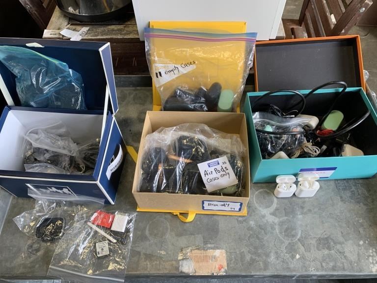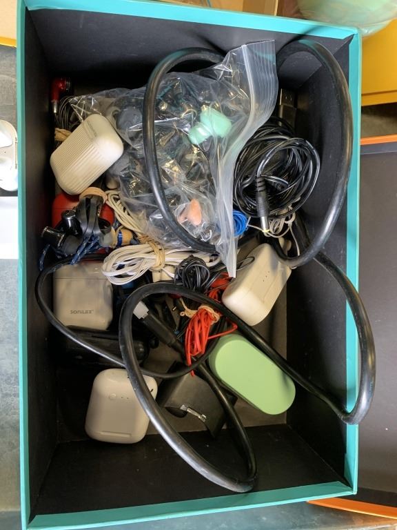 THREE BOXES OF ASSORTED ELECTRONICS, EAR BUDS, CHARGE CORDS ETC.