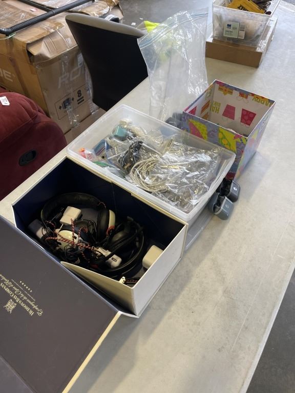 THREE BOXES OF ASSORTED ELECTRONICS, EAR BUDS, CHARGE CORDS ETC.