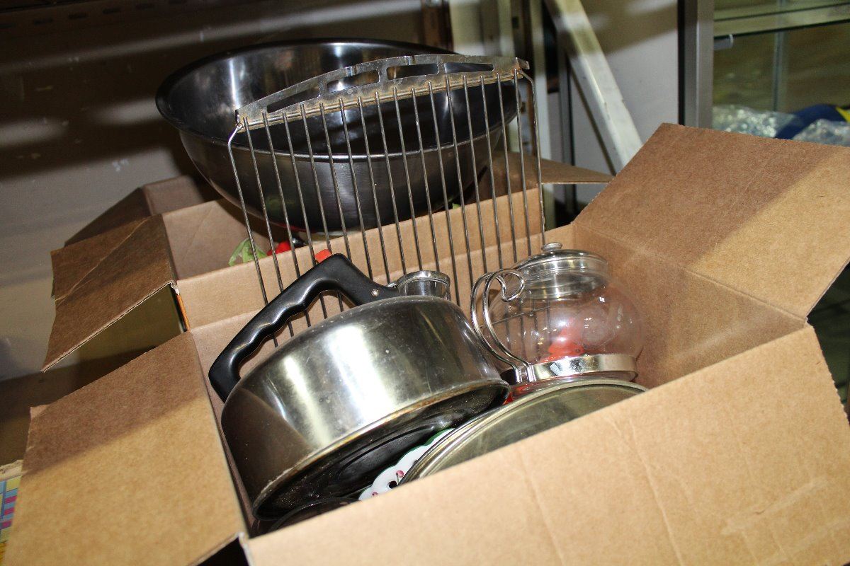 THREE BOXES OF KITCHEN WARE AND STAINLESS BOWL ETC