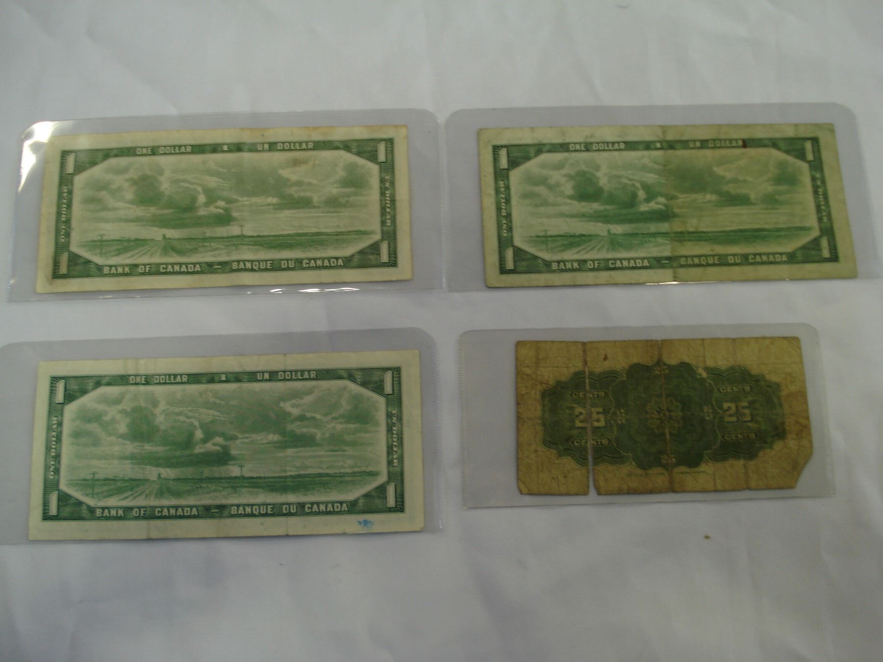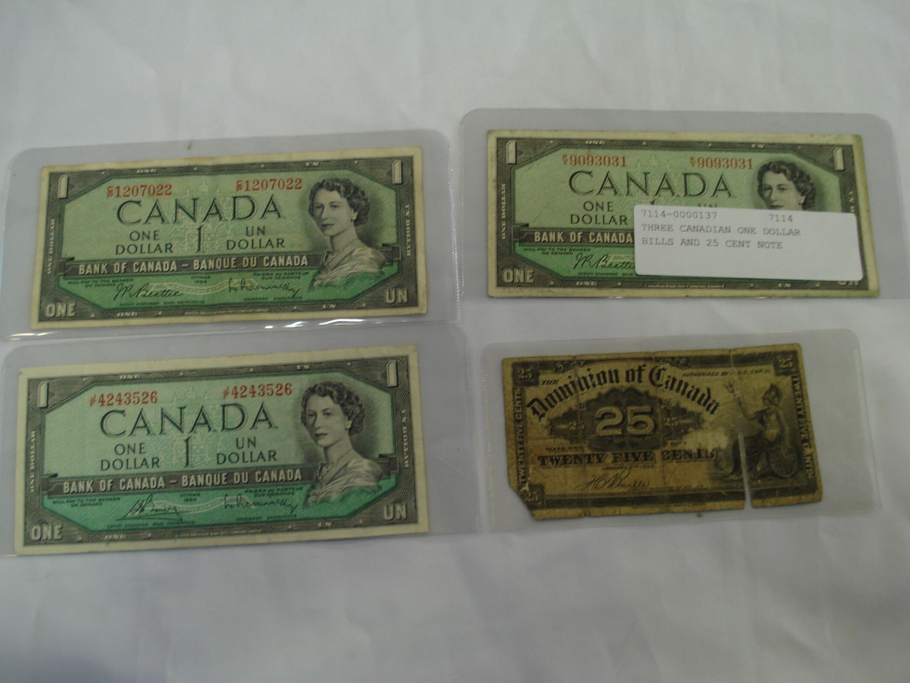 THREE CANADIAN ONE DOLLAR BILLS AND 25 CENT NOTE