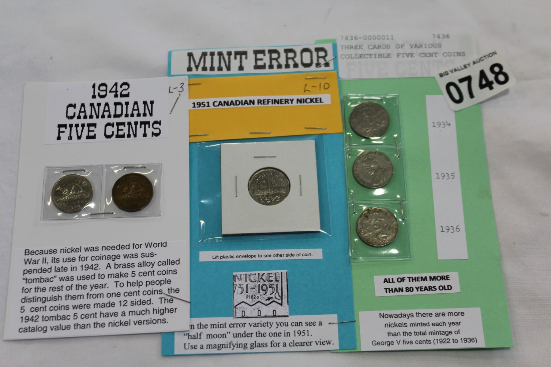 THREE CARDS OF VARIOUS COLLECTIBLE FIVE CENT COINS