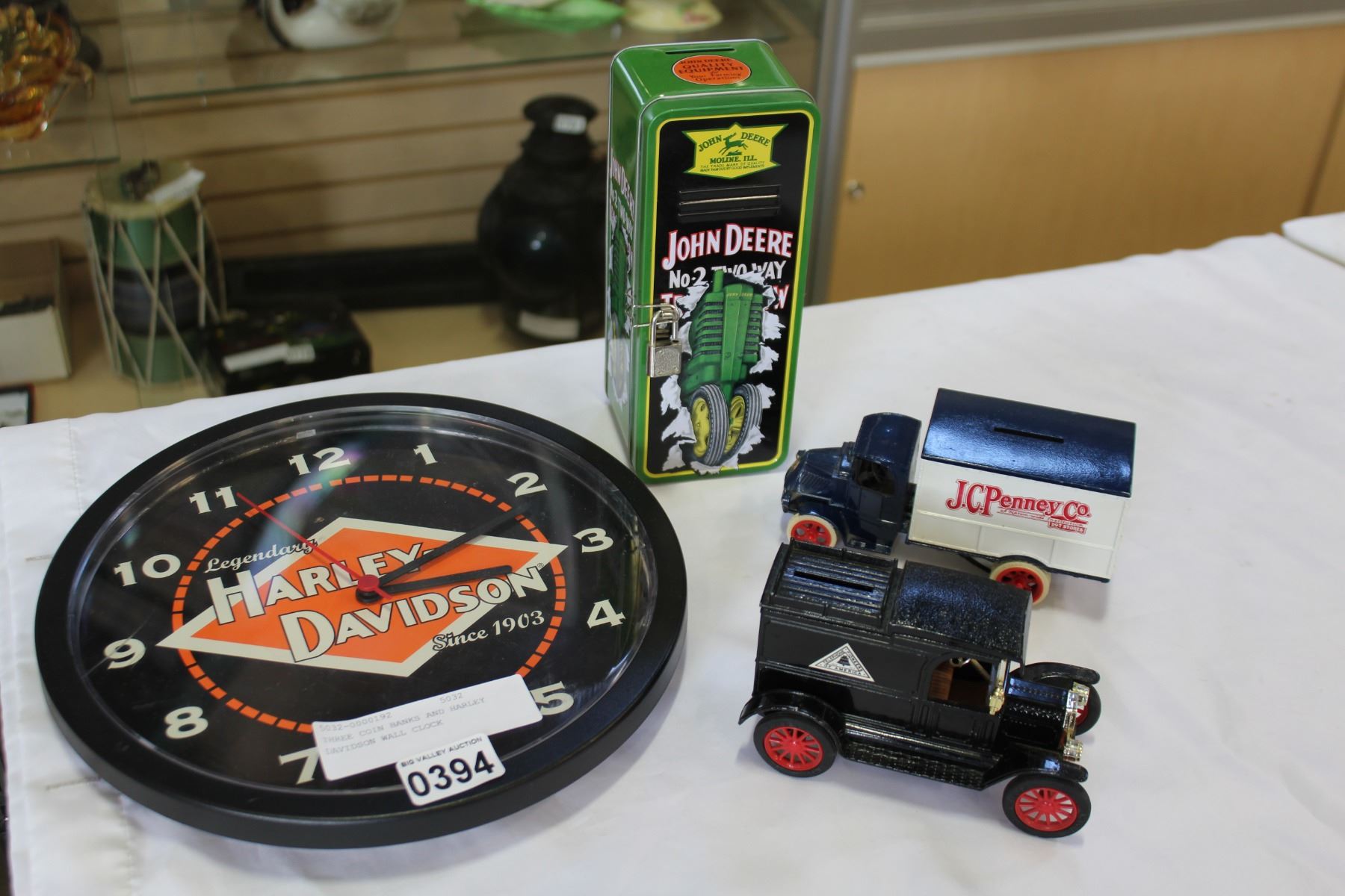 THREE COIN BANKS AND HARLEY DAVIDSON WALL CLOCK
