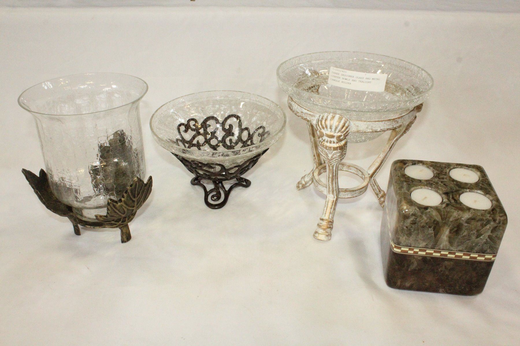 THREE DESIGNER GLASS AND METAL CENTER BOWLS AND TEALIGHT CANDLE HOLDER