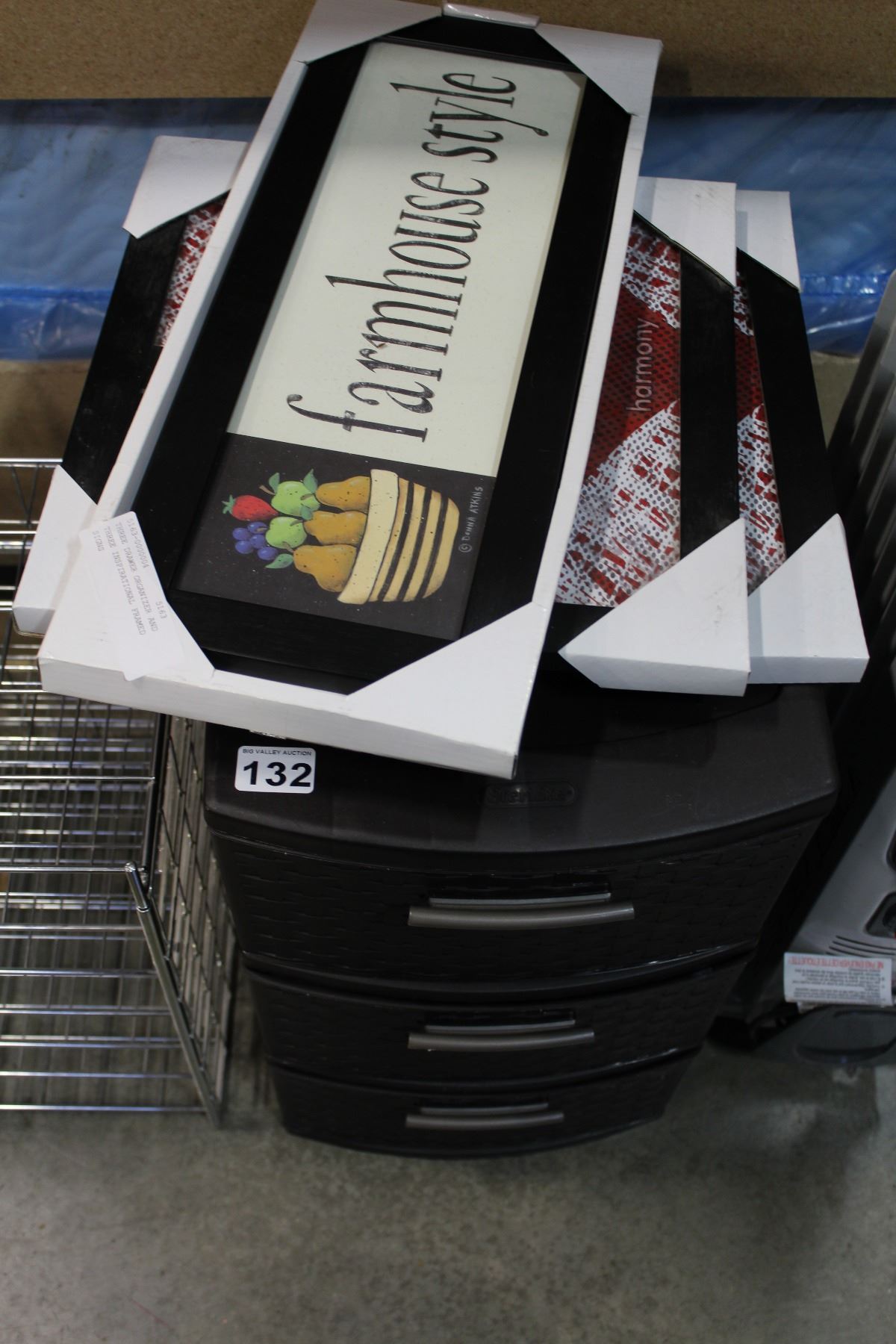 THREE DRAWER ORGANIZER AND THREE INSPIRATIONAL FRAMED SIGNS
