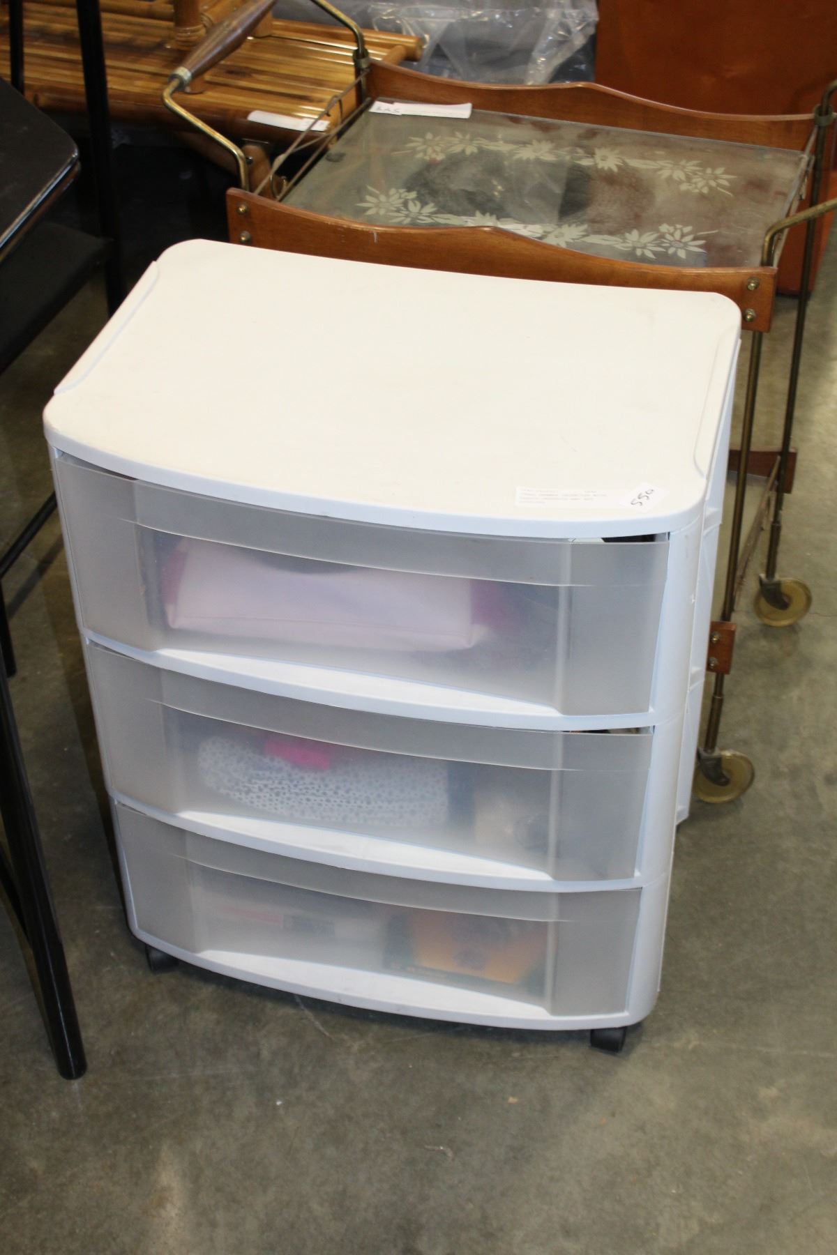 THREE DRAWER ORGANIZER WITH BEAUTY PRODUCTS AND ART SUPPLIES