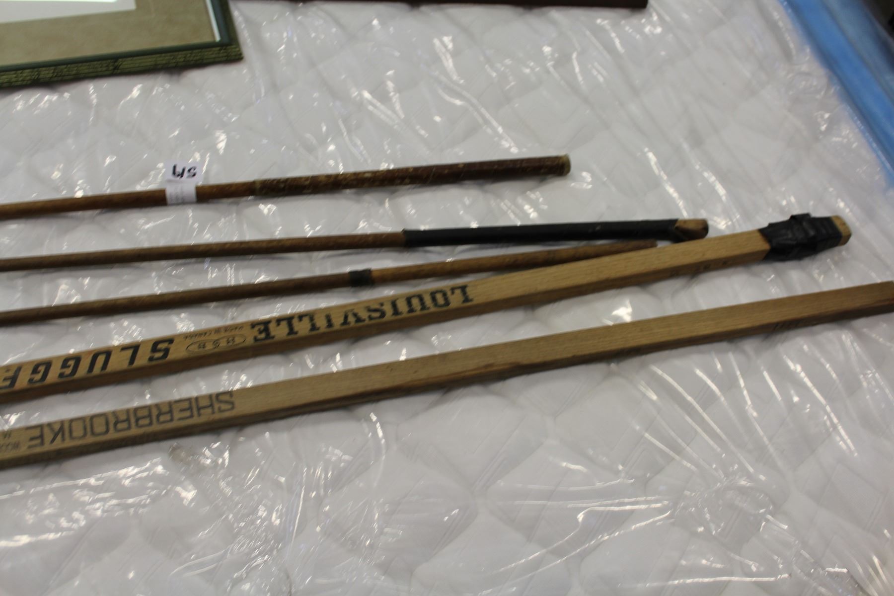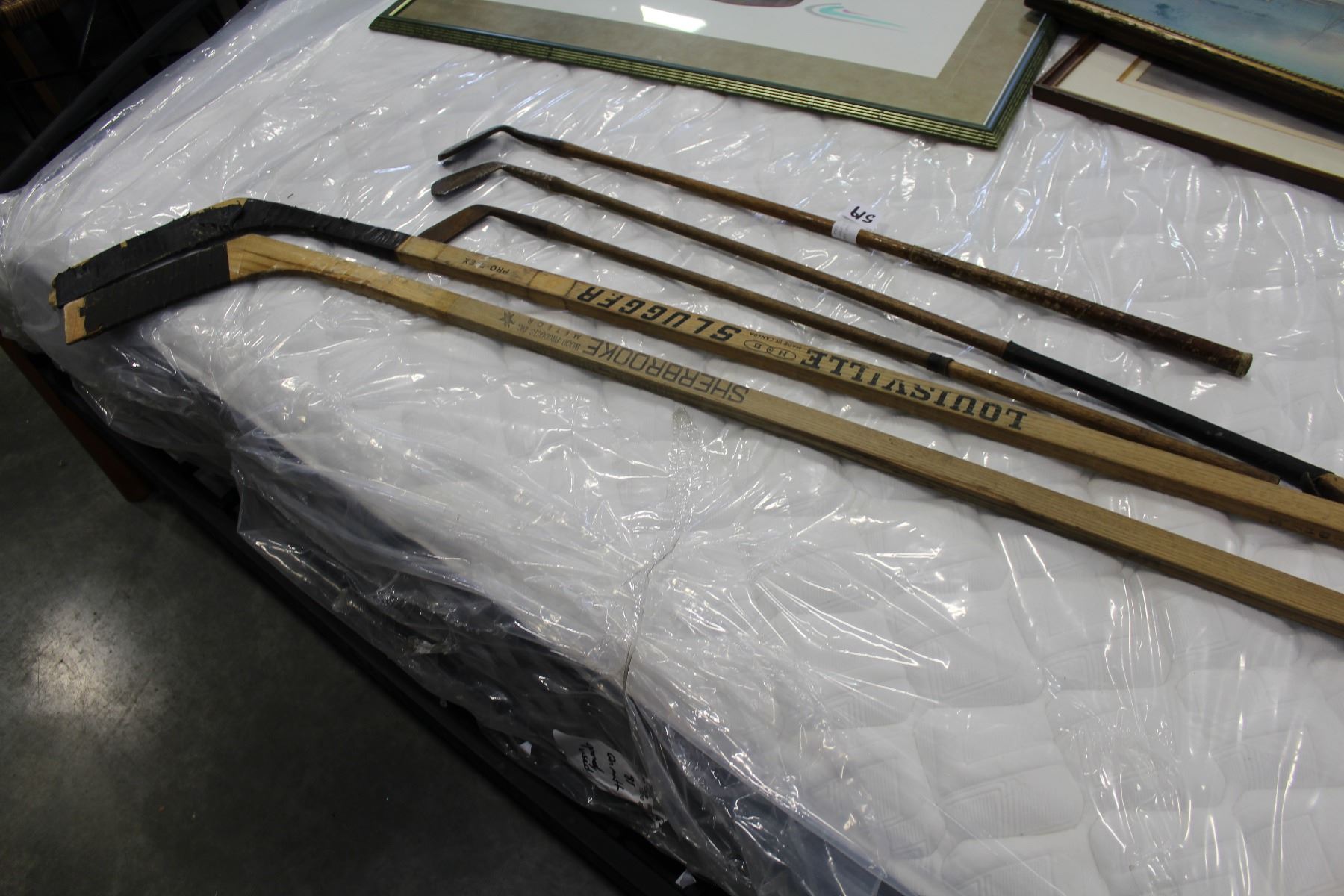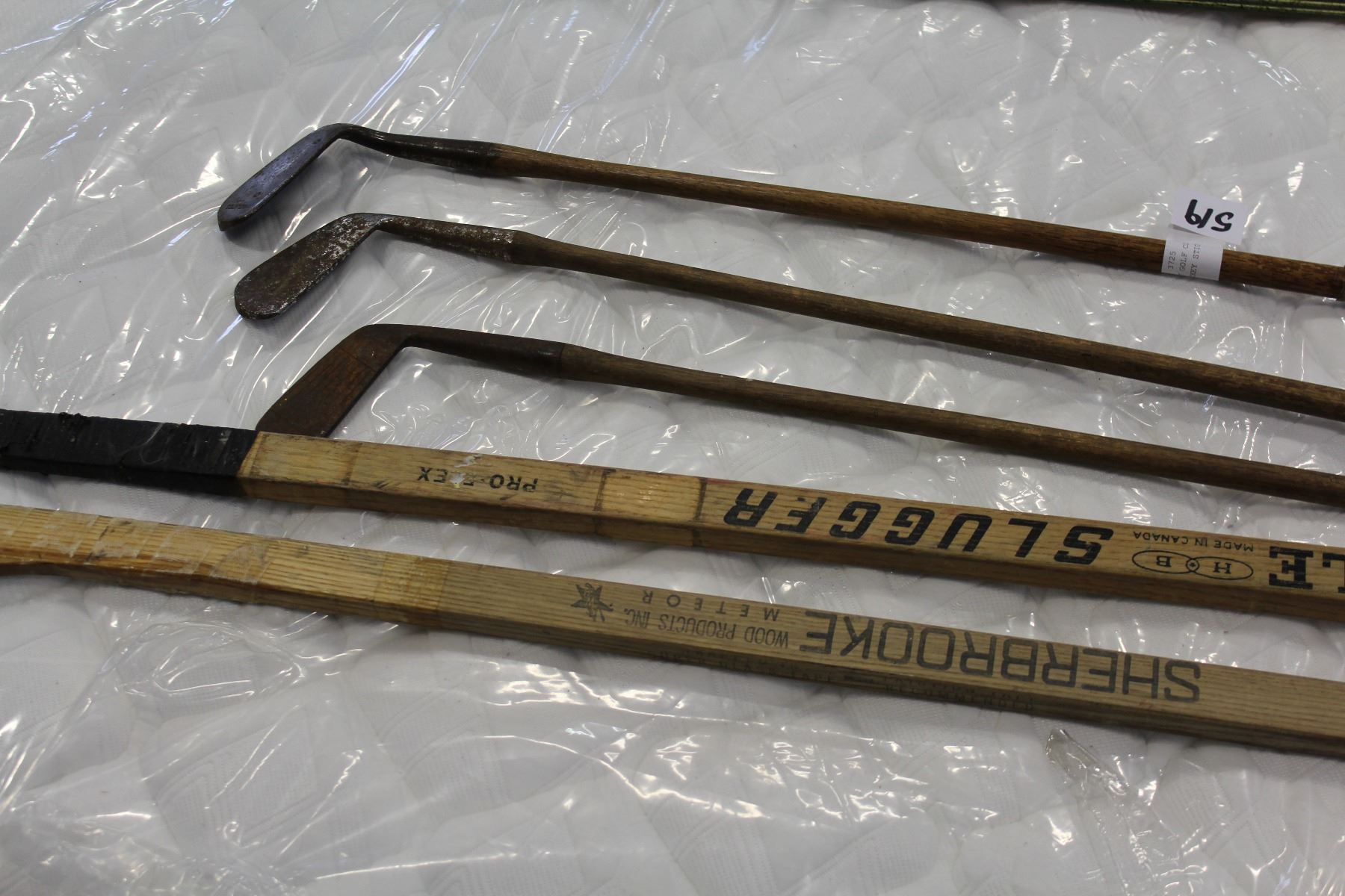 THREE HICKORY SHAFT GOLF CLUBS AND TWO ANTIQUE HOCKEY STICKS