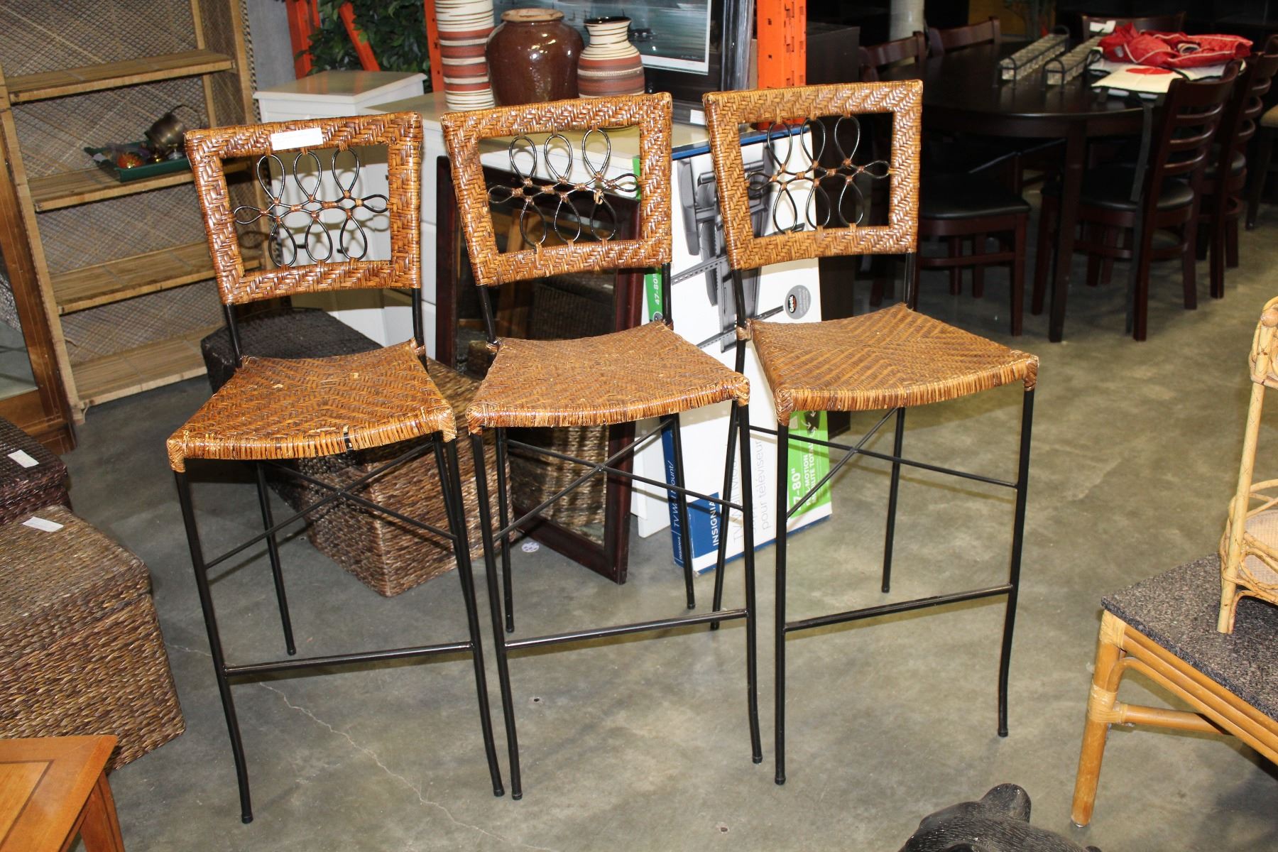 THREE IRON AND WICKER BAR STOOLS