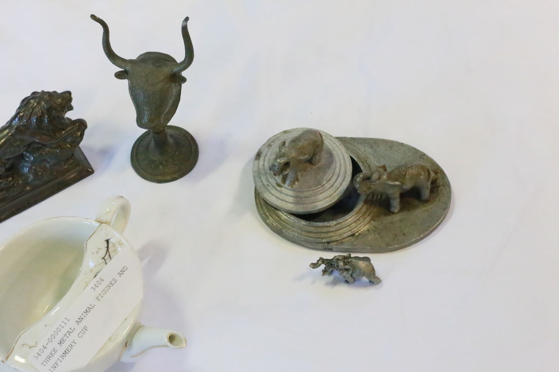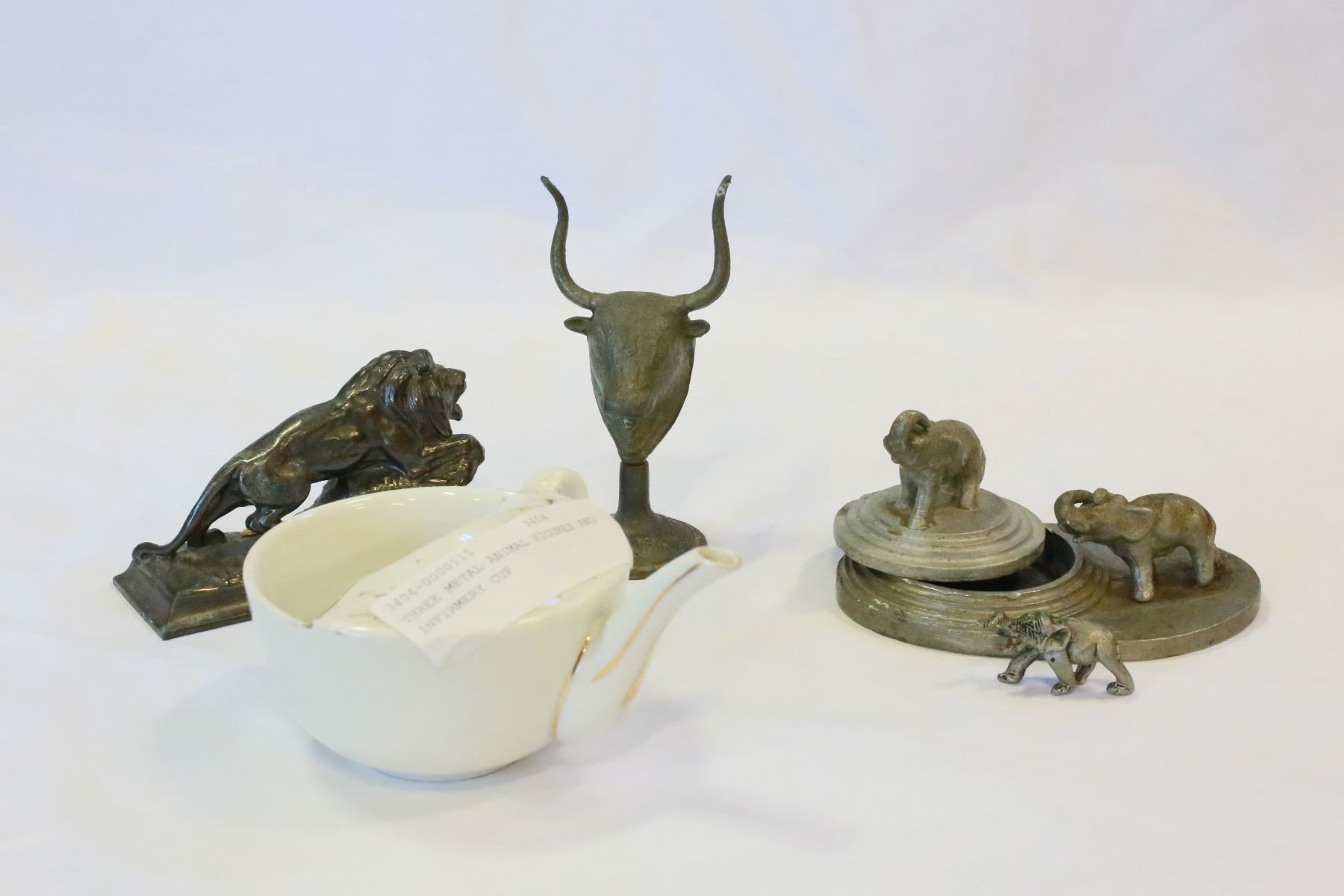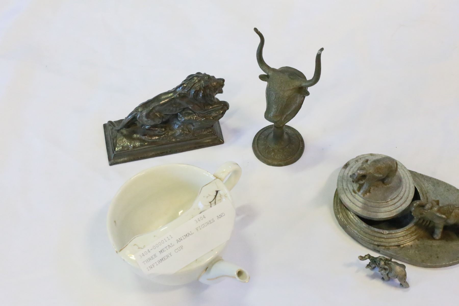 THREE METAL ANIMAL FIGURES AND INFIRMERY CUP