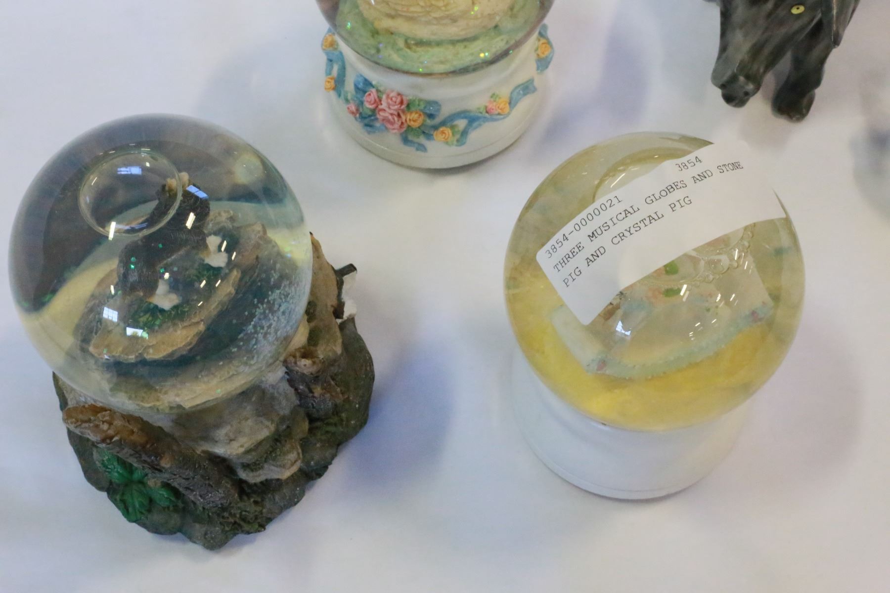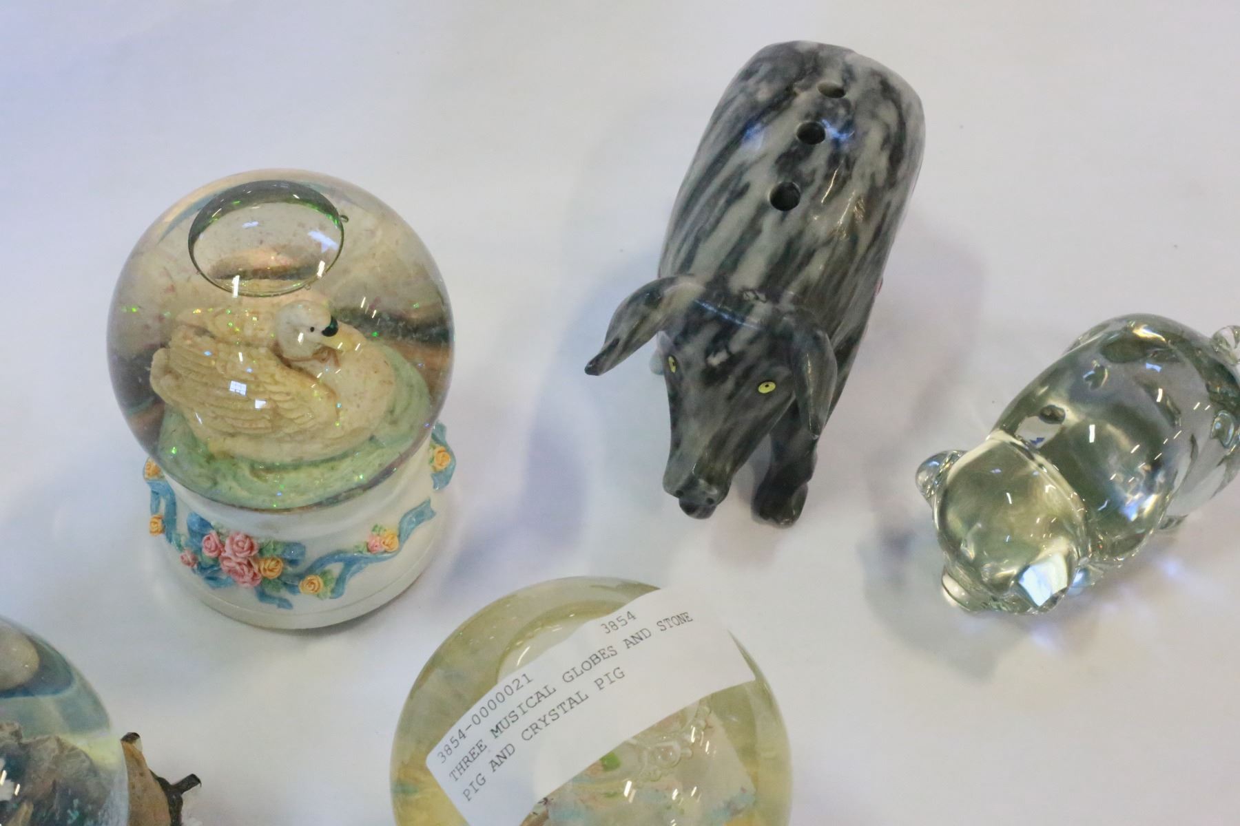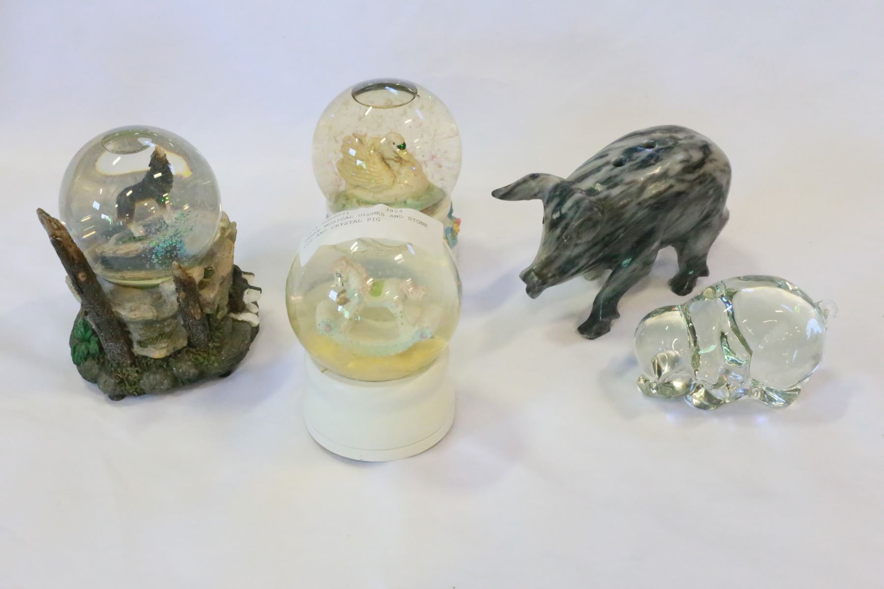 THREE MUSICAL GLOBES AND STONE PIG AND CRYSTAL PIG
