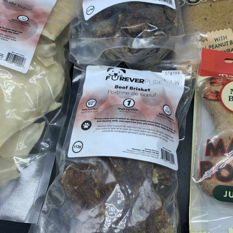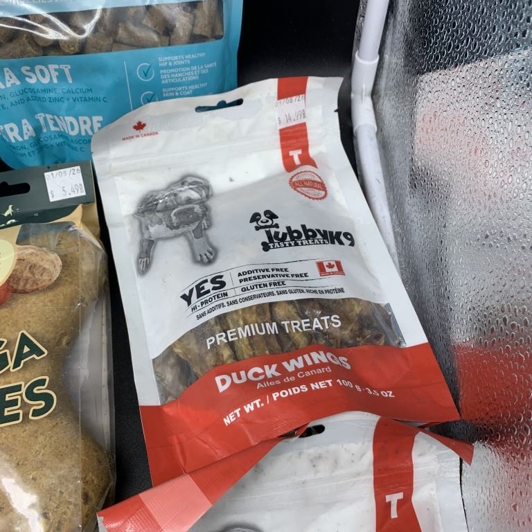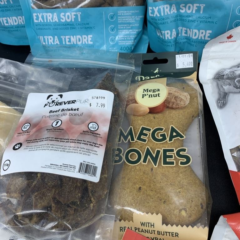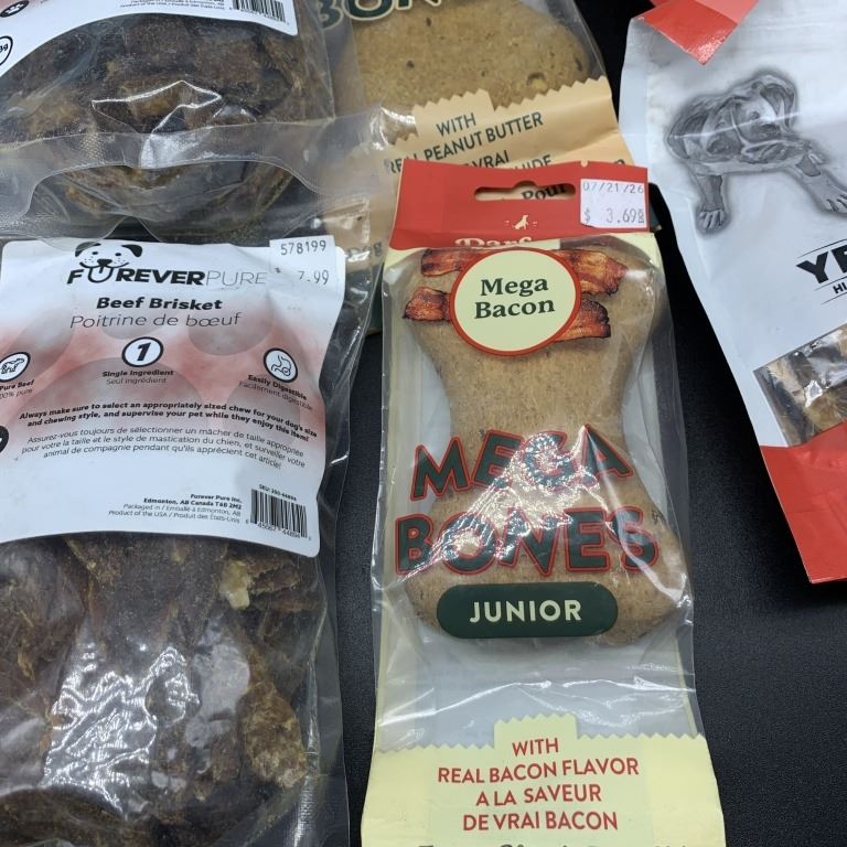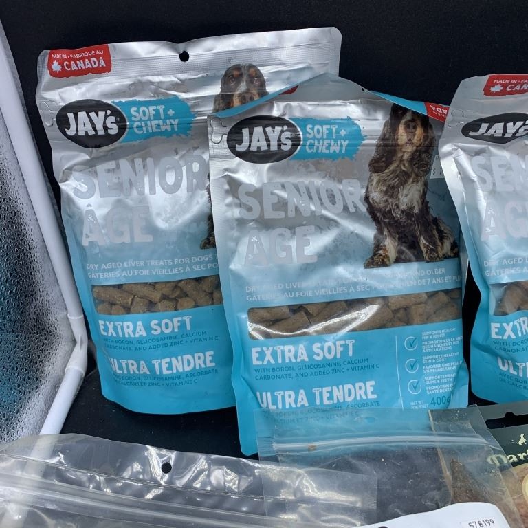THREE NEW BAGS OF SENIOR AGE EXTRA SOFT DRY AGED LIVER TREATS, BEEF CULLIGAN CHIPS, BEEF BRISKET TREATS, MEGA BONES AND DUCK WINGS BEST BEFORE 2026