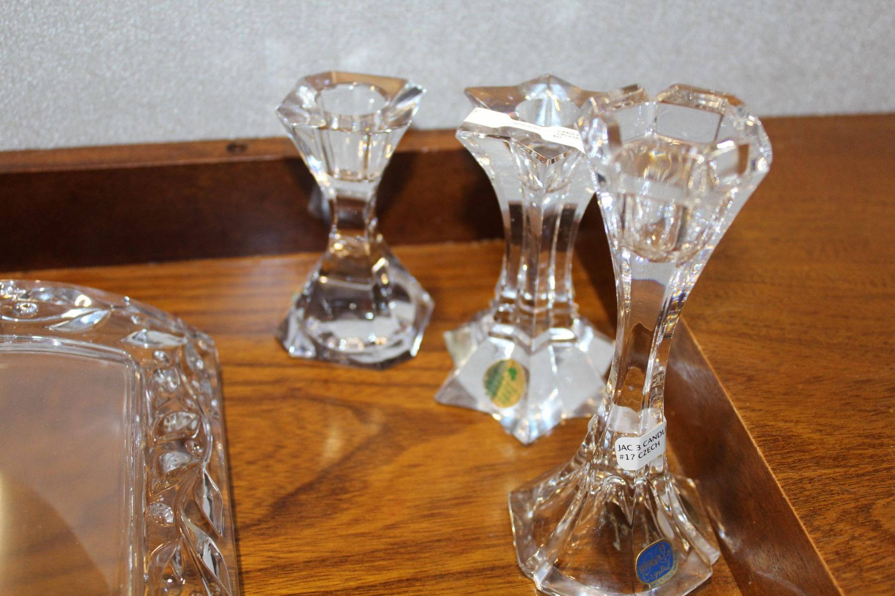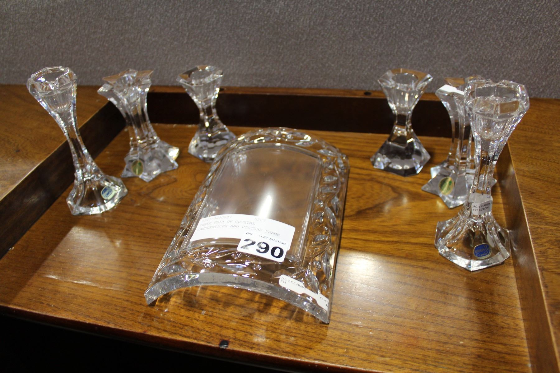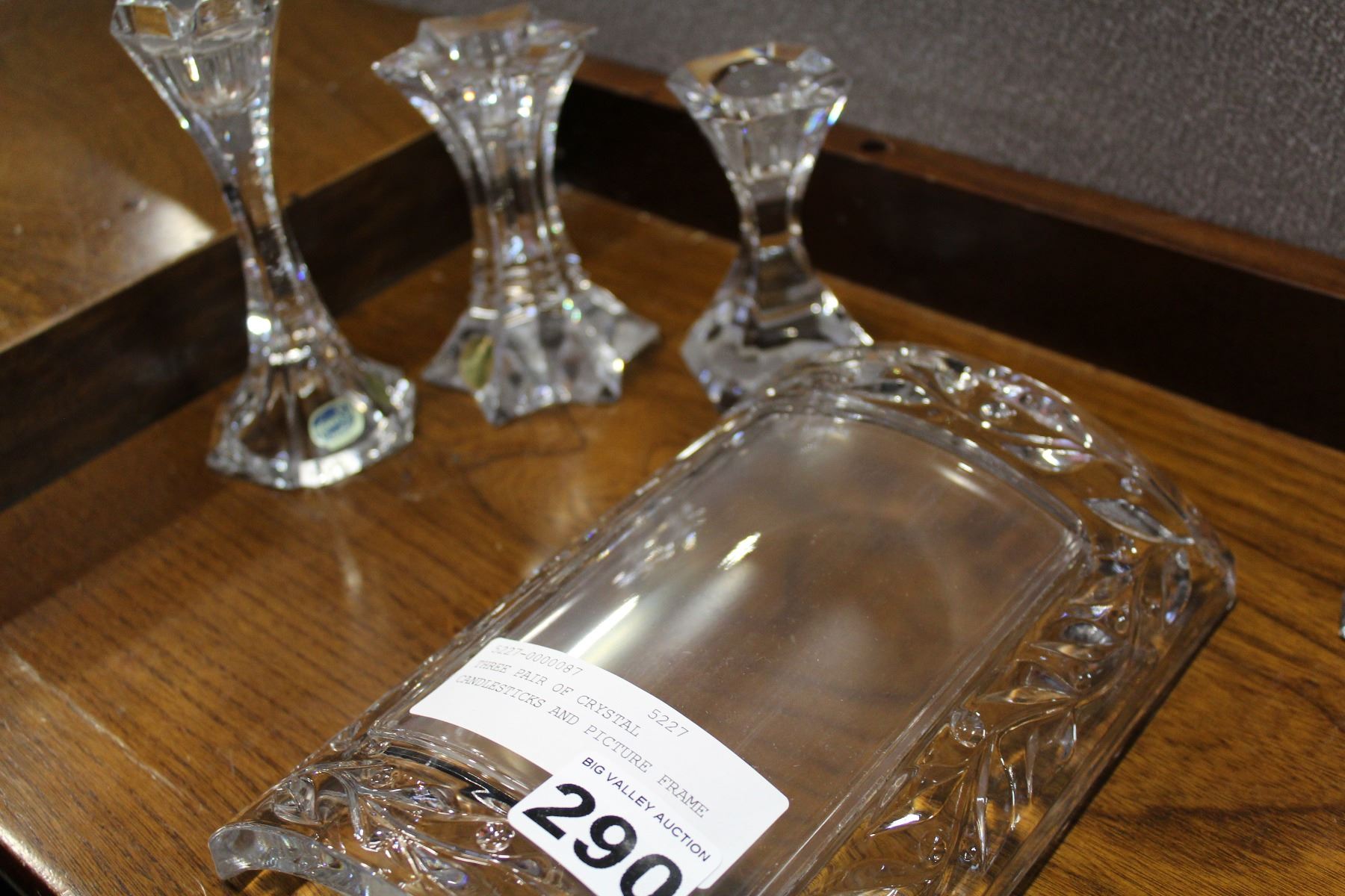 THREE PAIR OF CRYSTAL CANDLESTICKS AND PICTURE FRAME