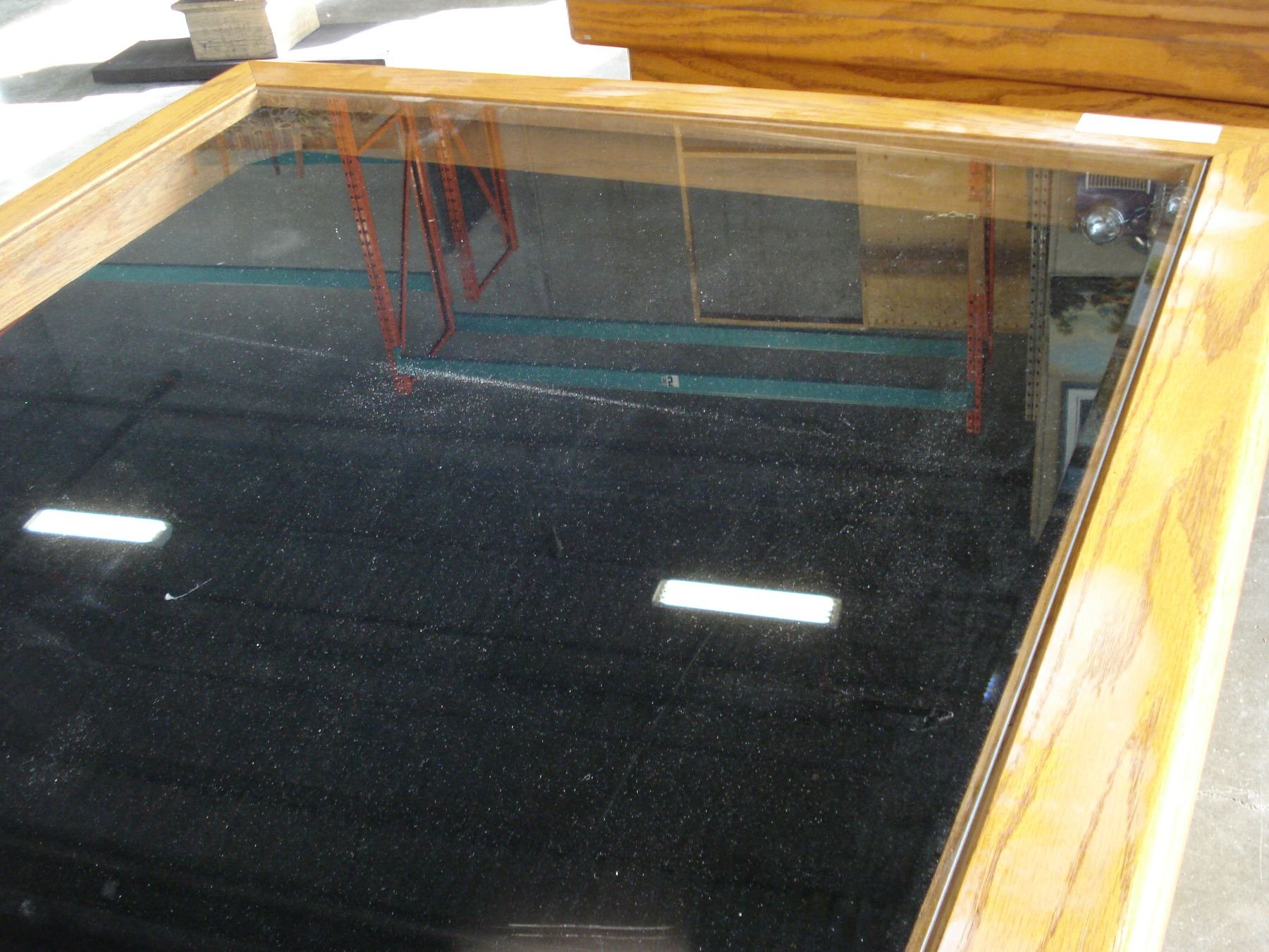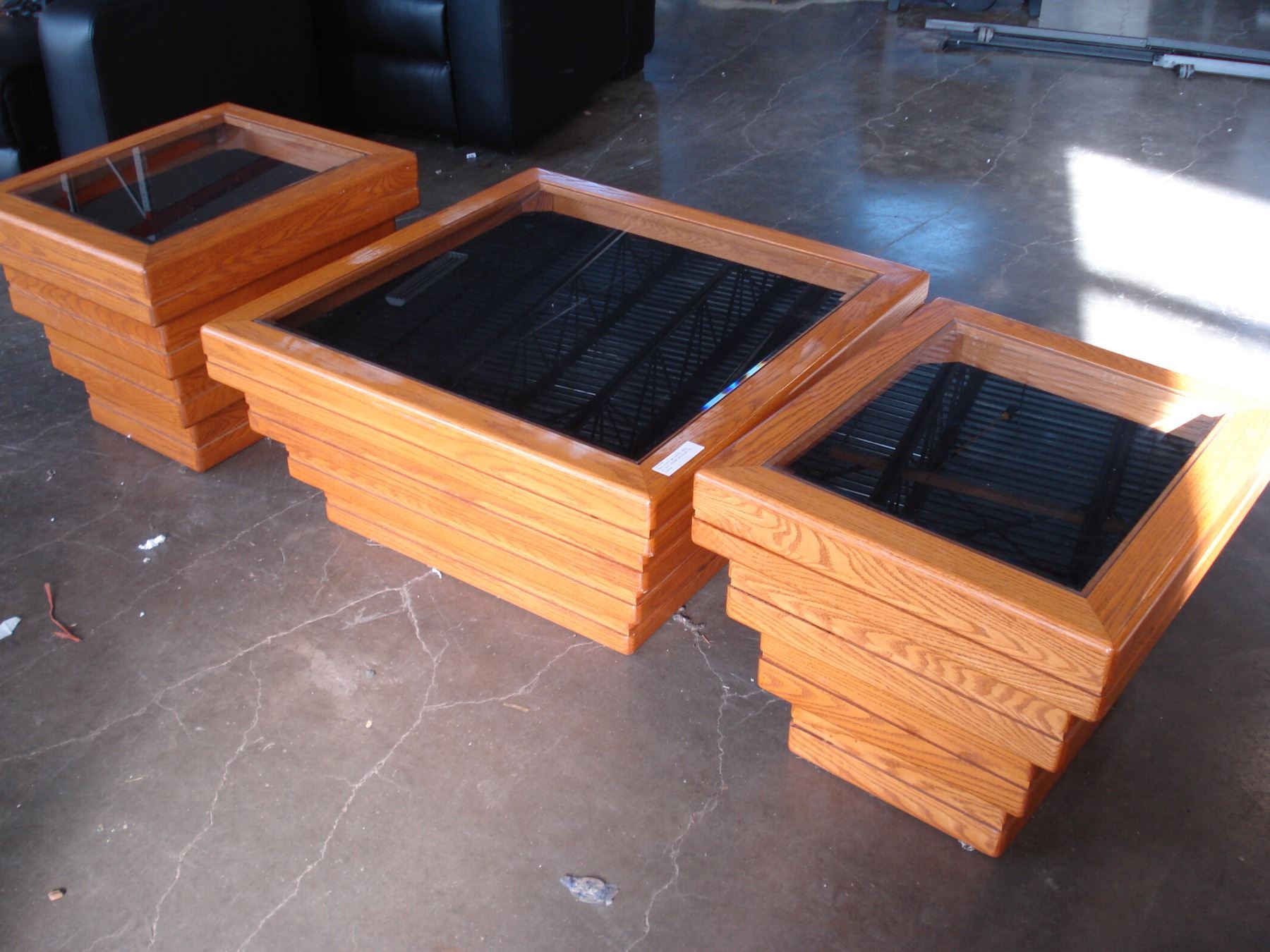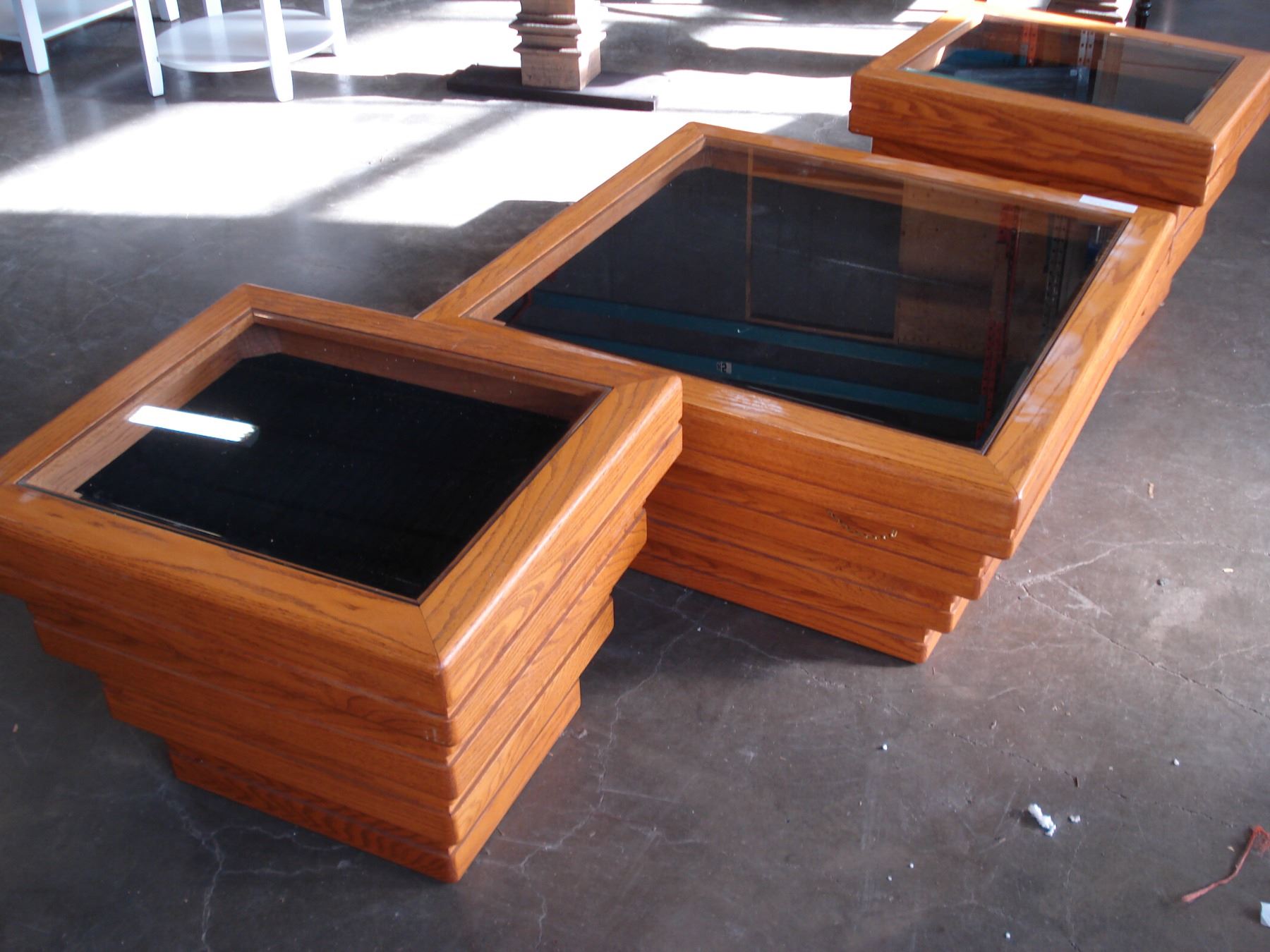 THREE PIECE OAK COFFEE TABLE SET WITH SHADOW BOX GLASS TOP STORAGE