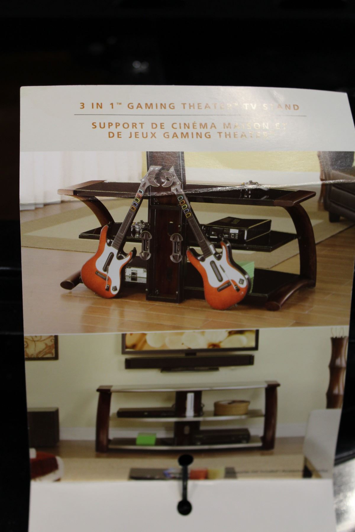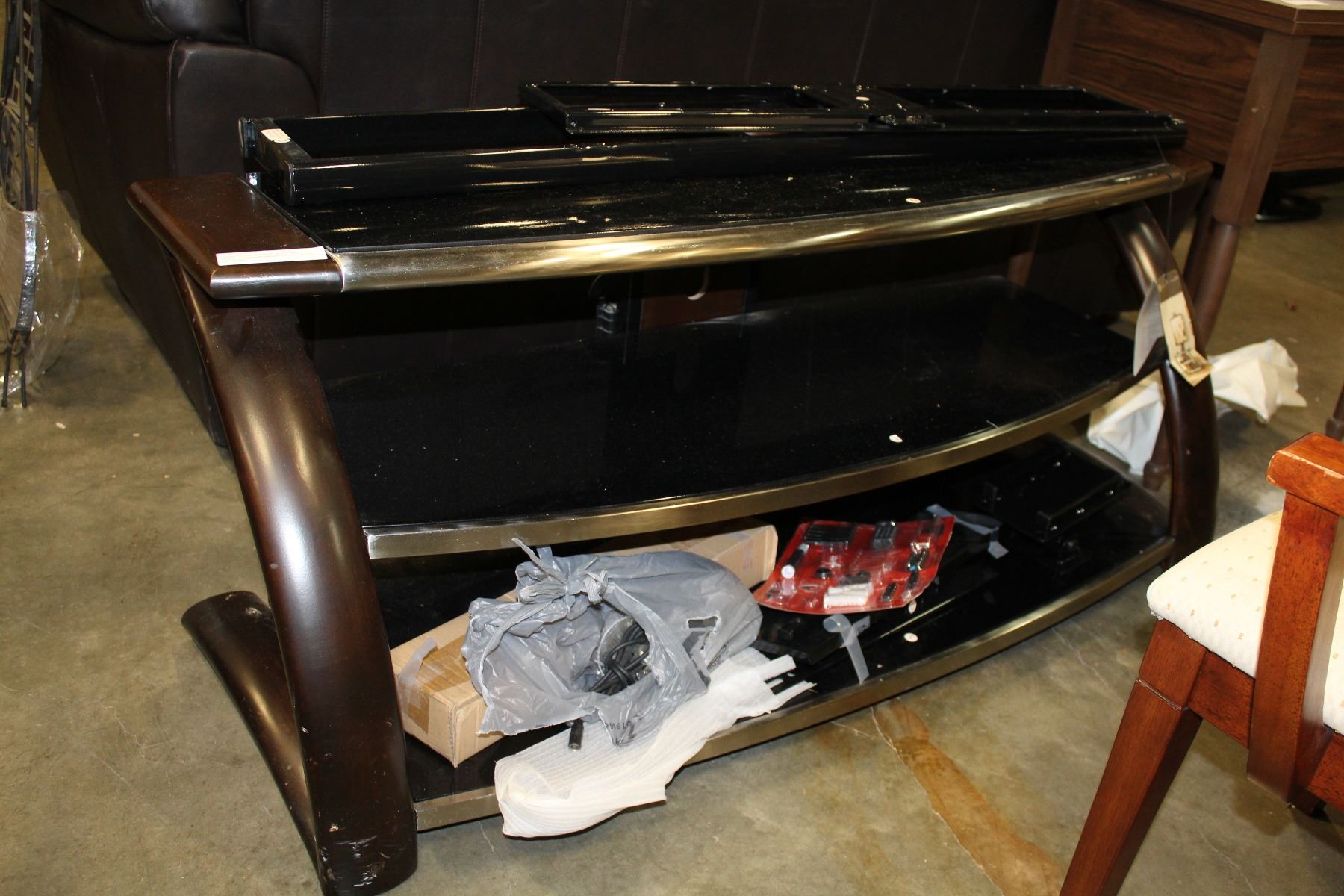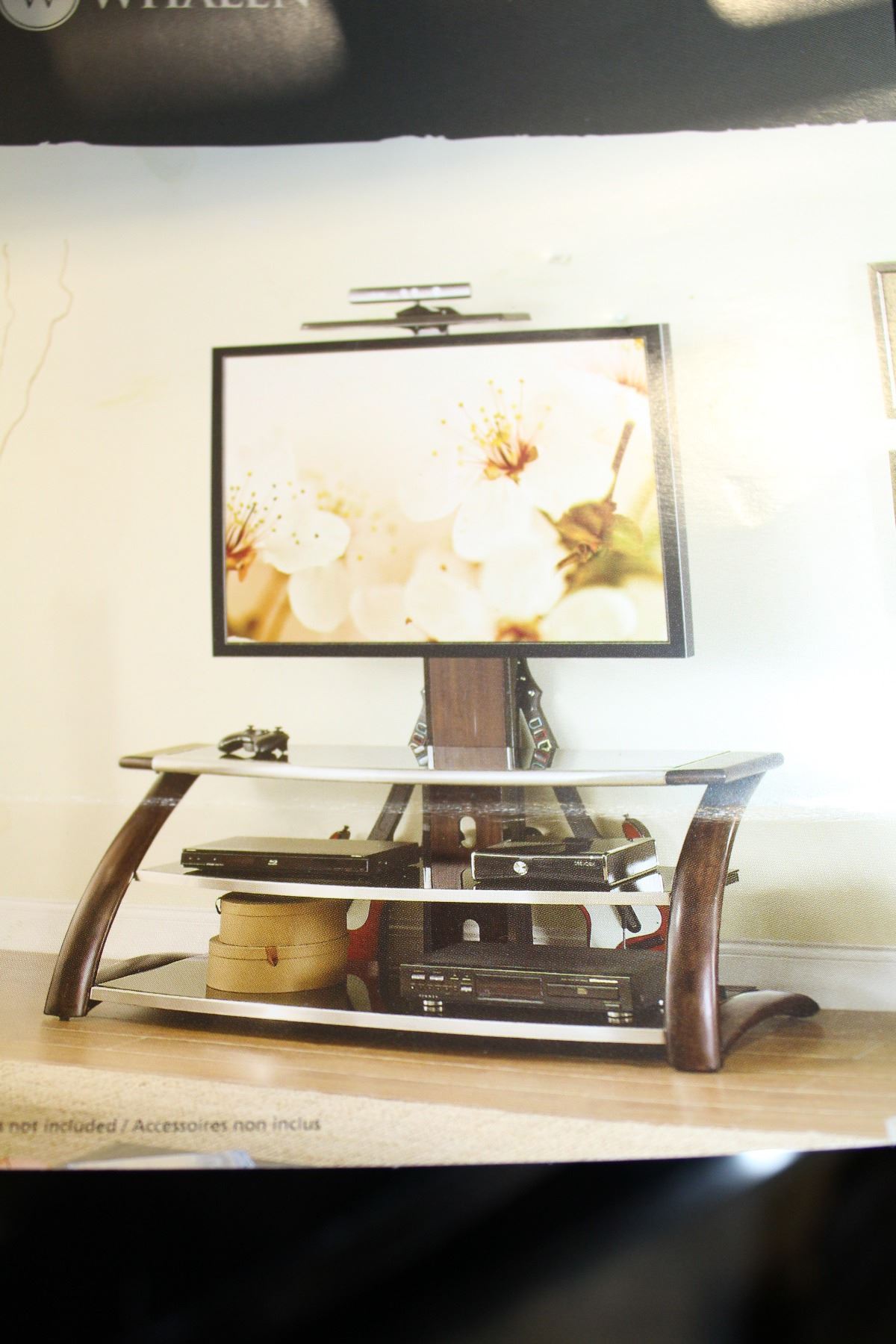 THREE TIER MODERN WOOD AND GLASS ENTERTAINMENT STAND WITH TV MOUNT