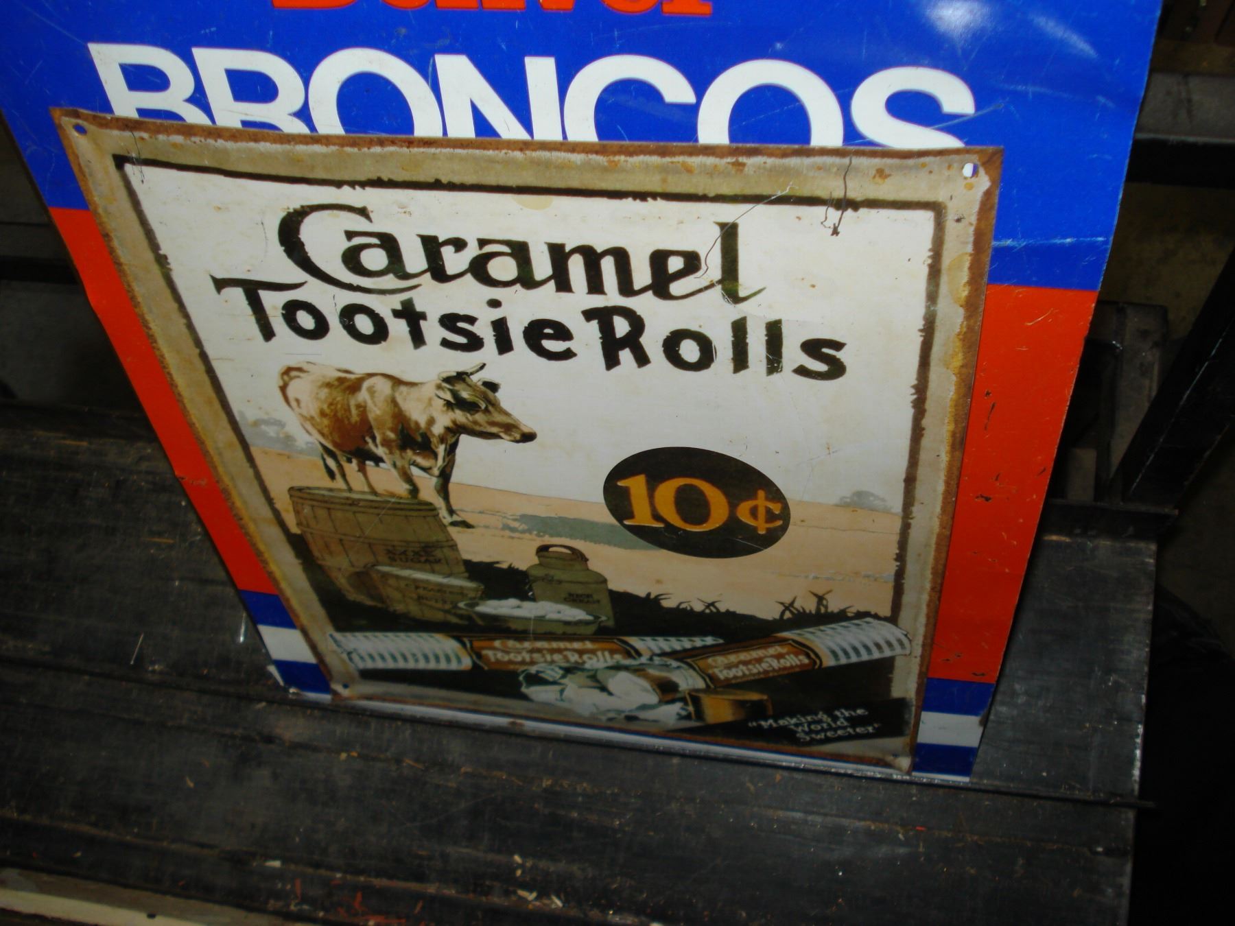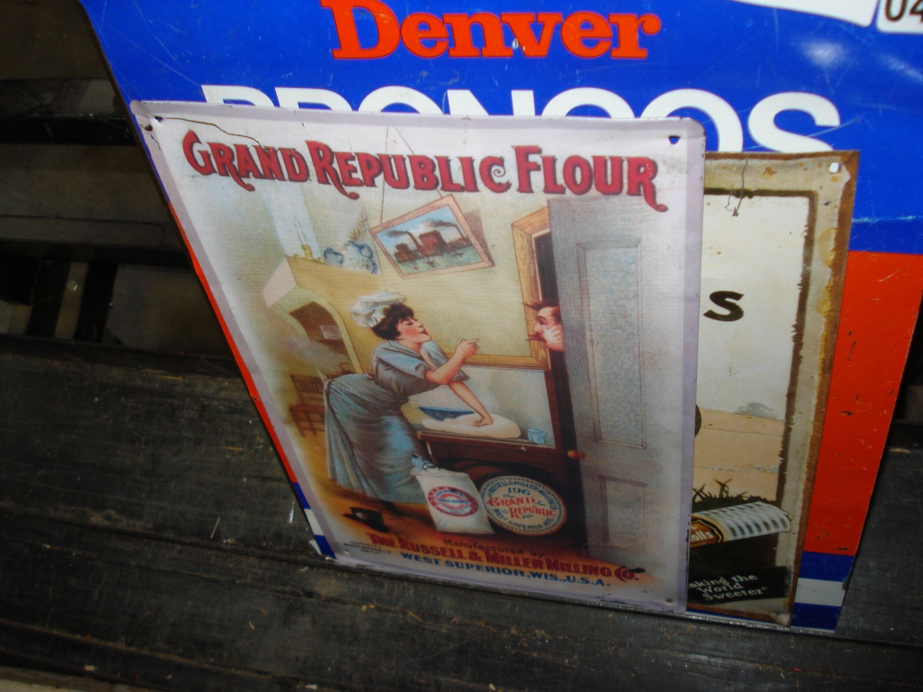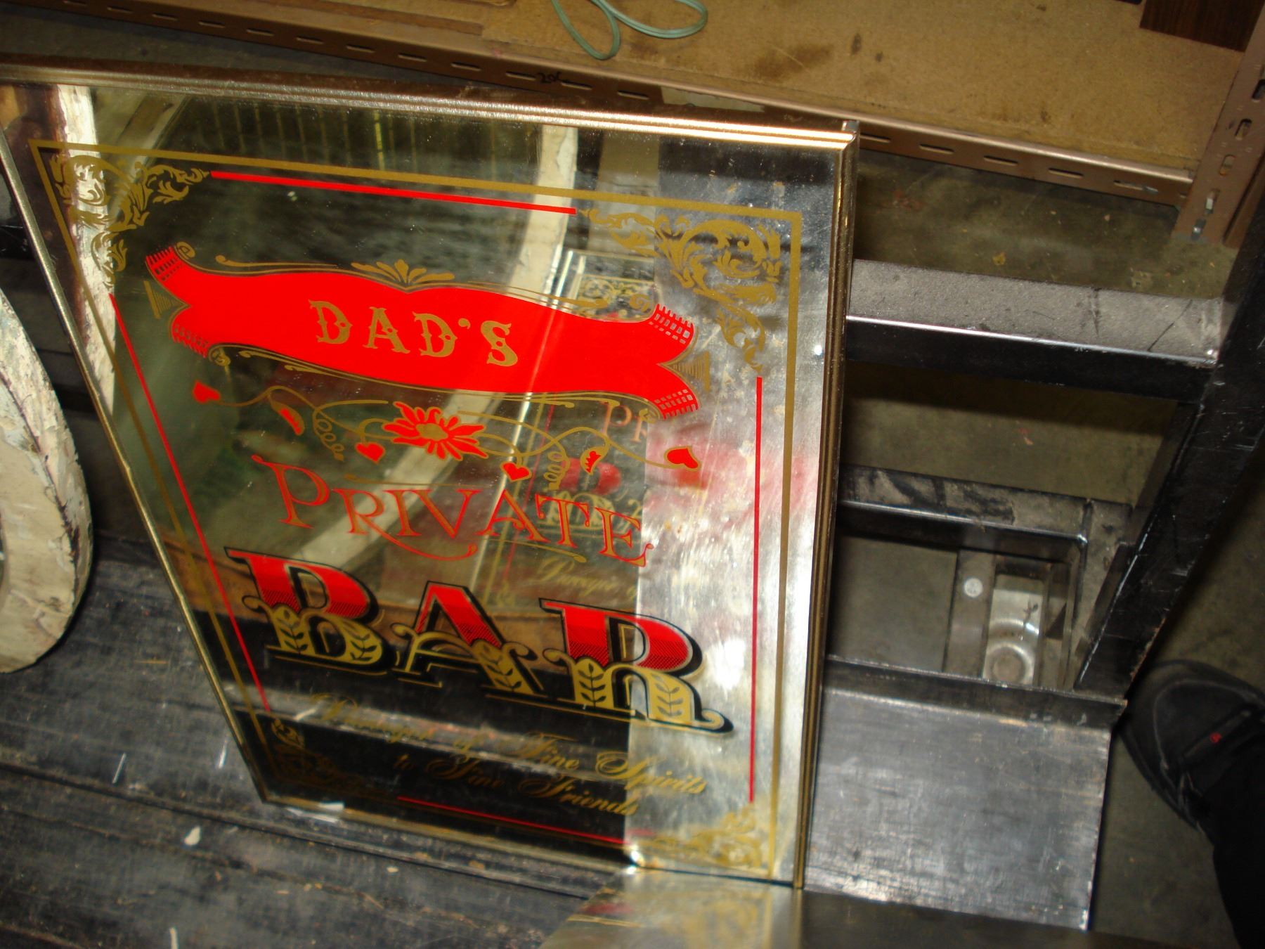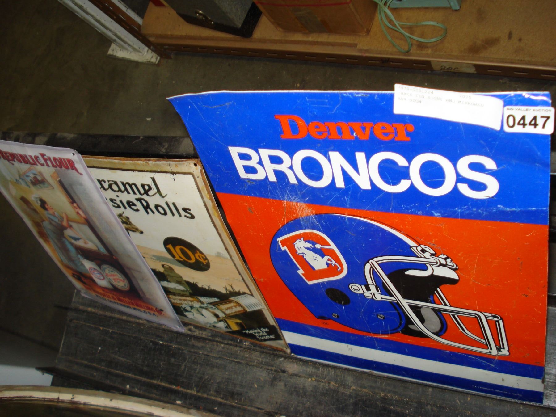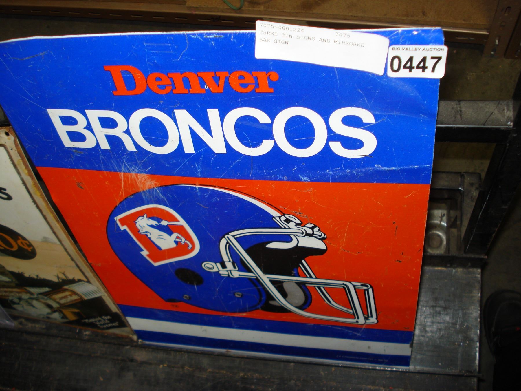 THREE TIN SIGNS AND MIRRORED BAR SIGN