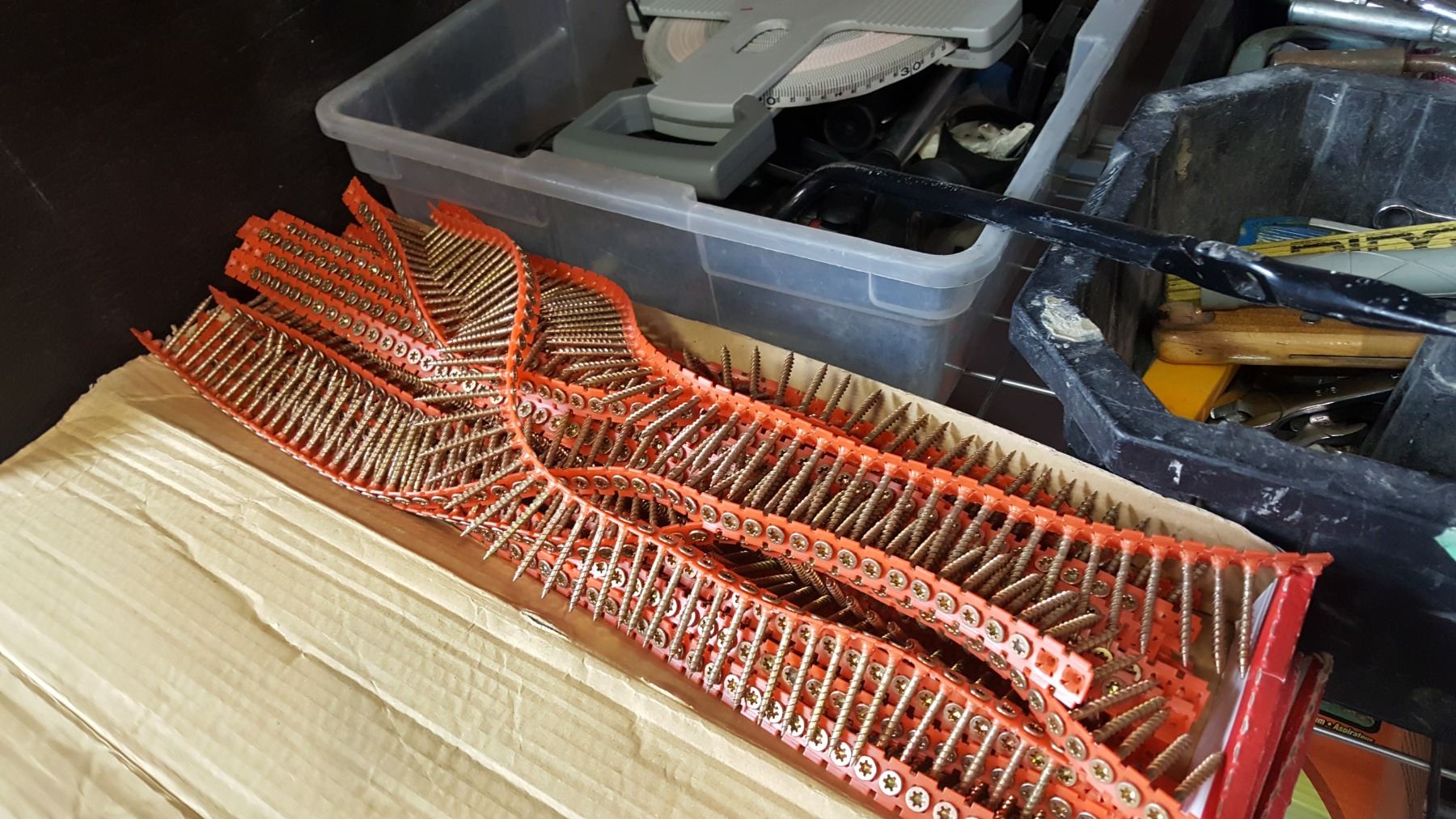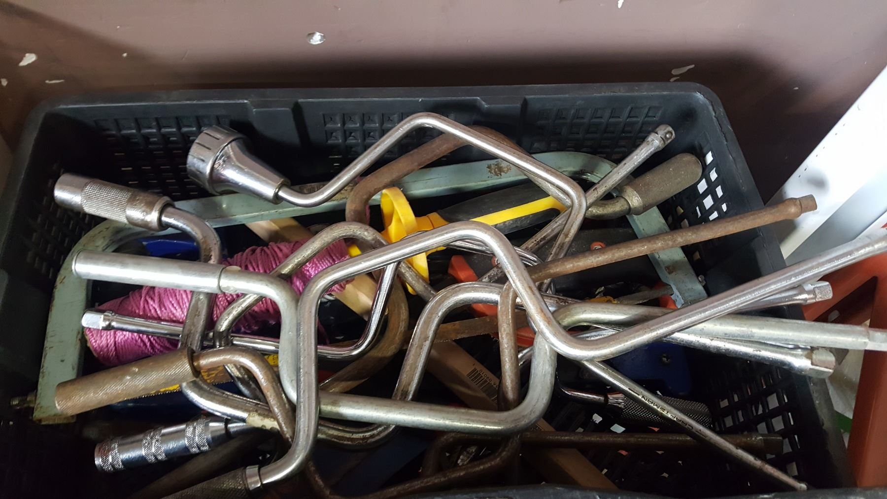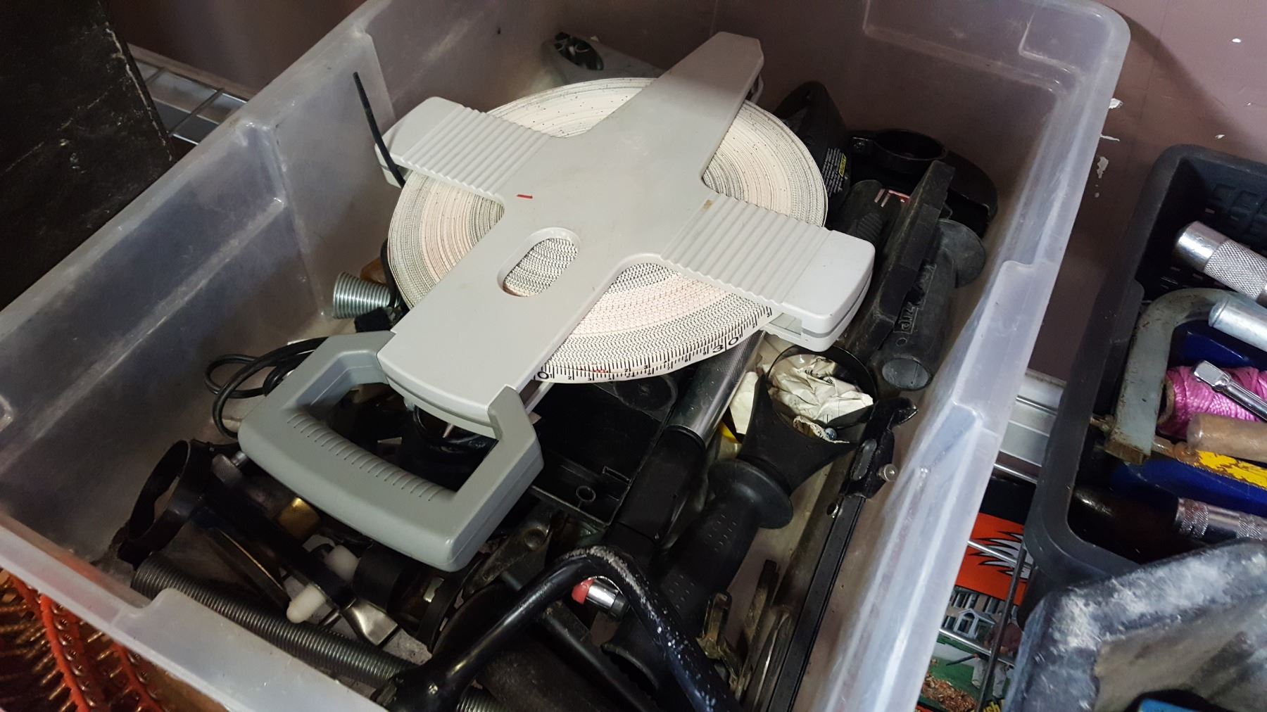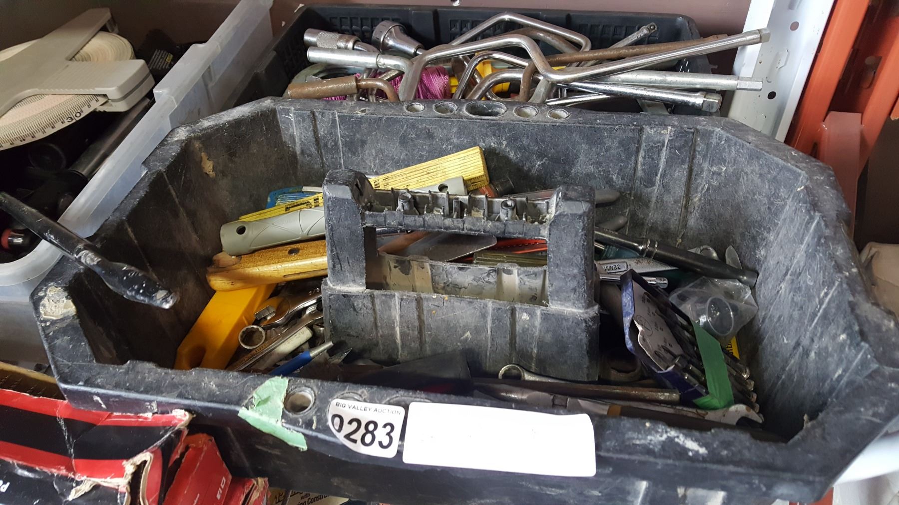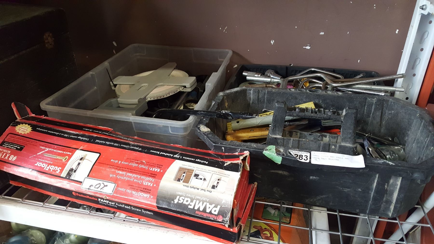THREE TOTES AND TOOLS AND LARGE TAPE MEASURE