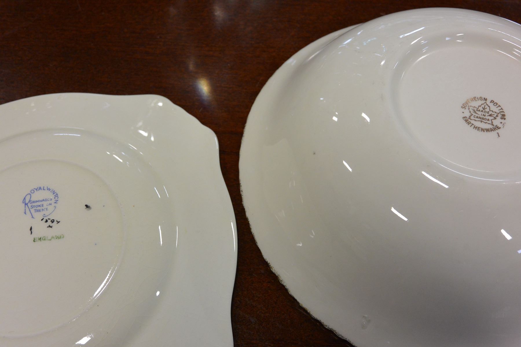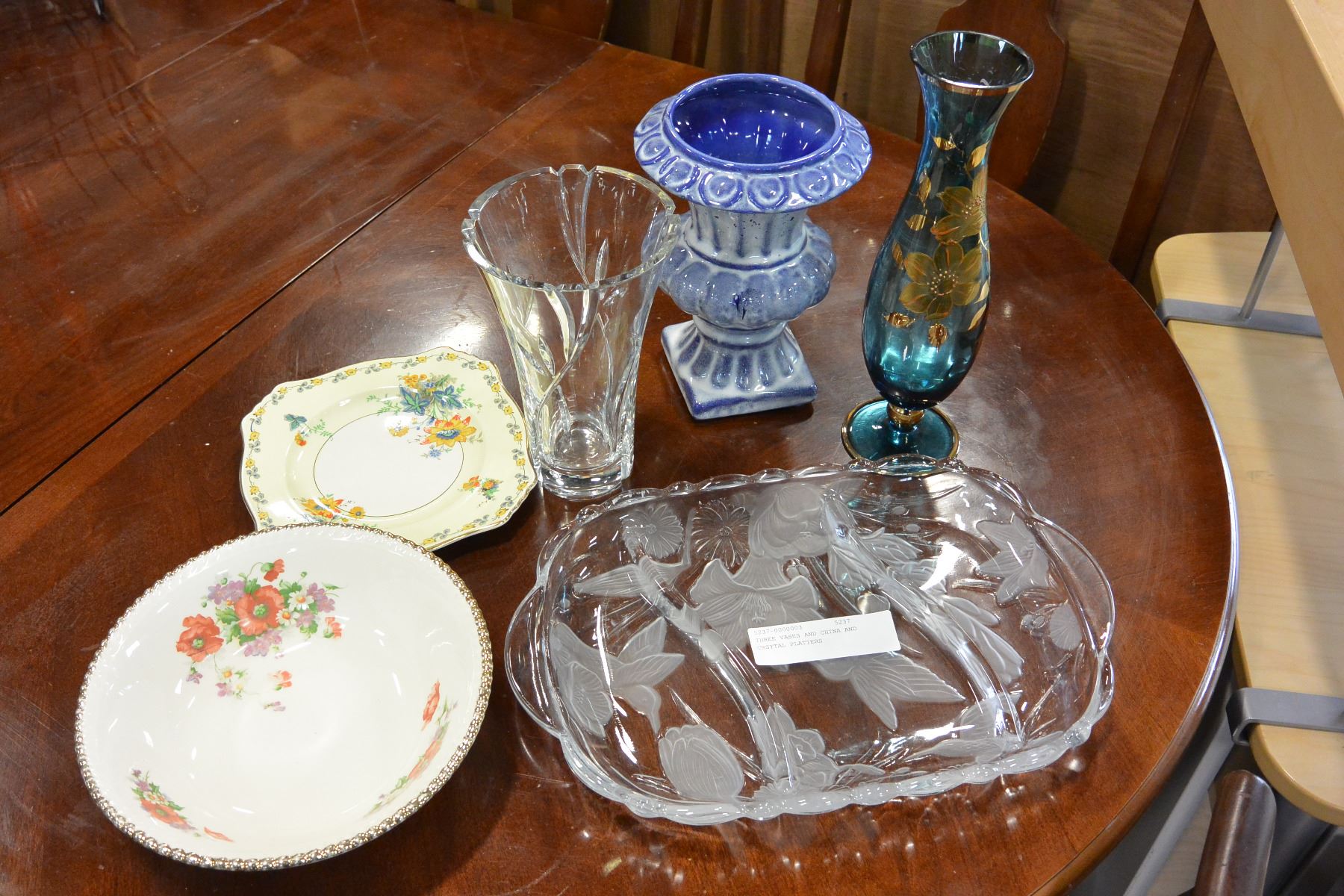 THREE VASES AND CHINA AND CRSYTAL PLATTERS
