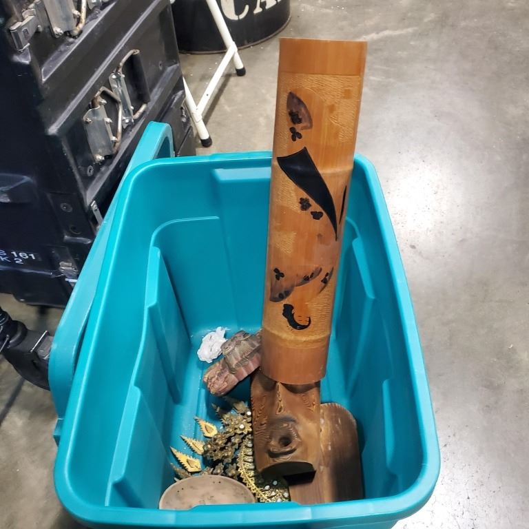 THREE VINTAGE OIL PAINTINGS AND WOOD CARVED ITEMS IN TOTE