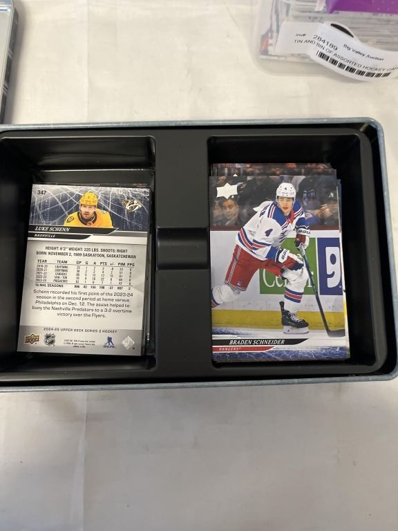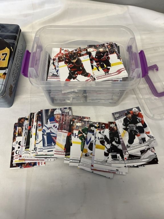 TIN AND BIN OF ASSORTED HOCKEY CARDS, MOSTLY UPPER DECK
