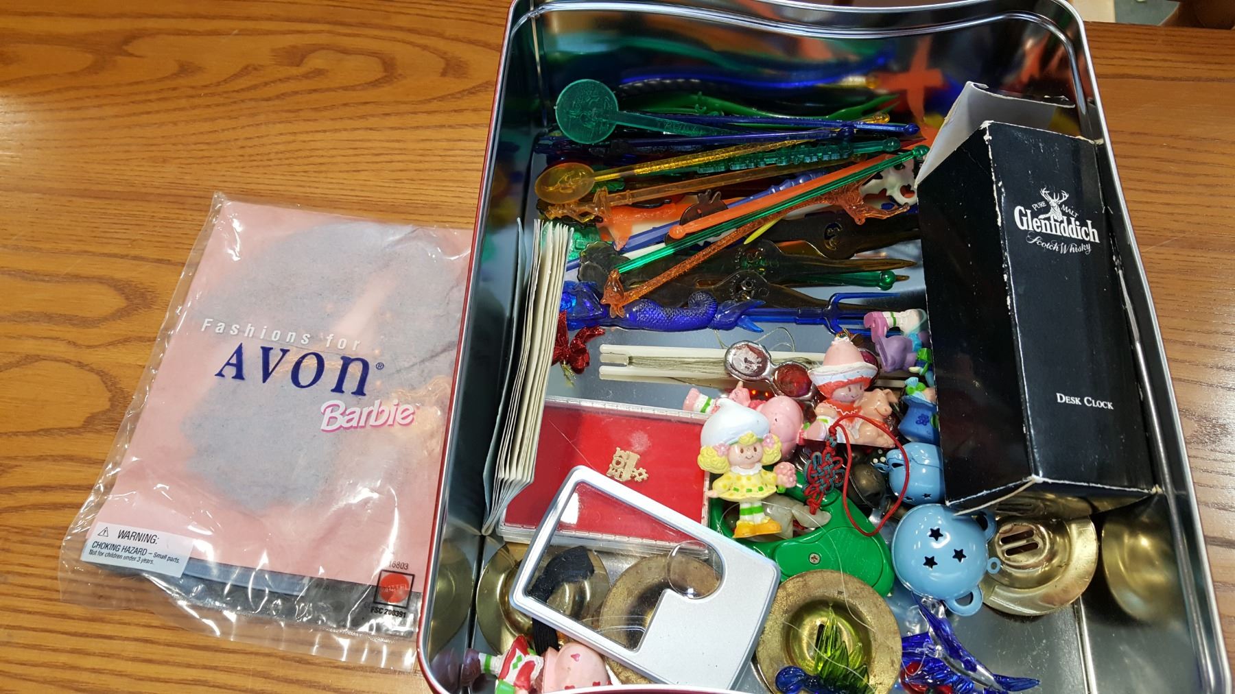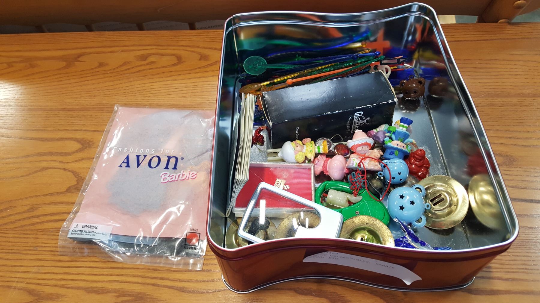 TIN OF COLLECTIBLES, BARBIE DRESS, ETC