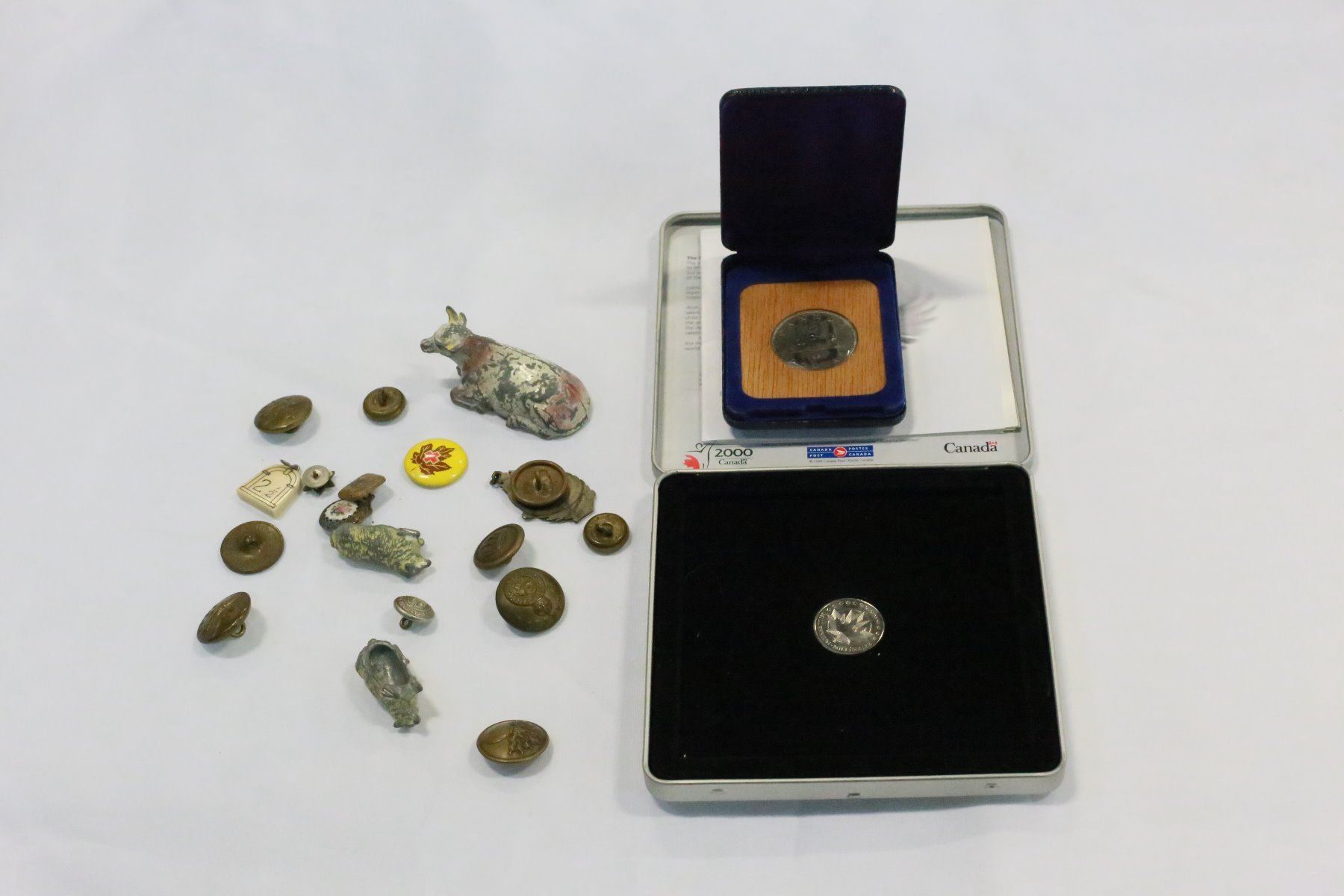 TIN OF MILITARY BUTTONS AND COLLECTIBLES AND COLLECTIBLE COINS