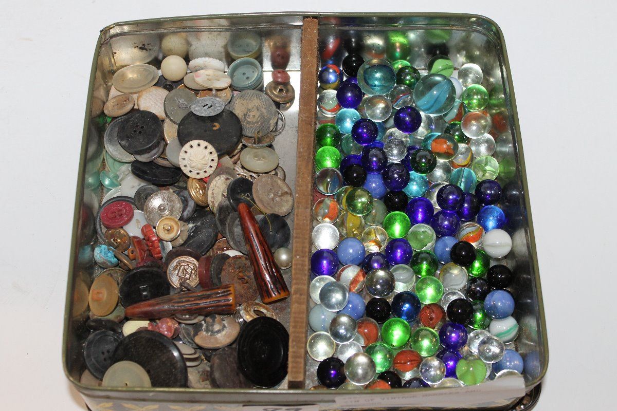 TIN OF VINTAGE MARBLES AND BUTTONS