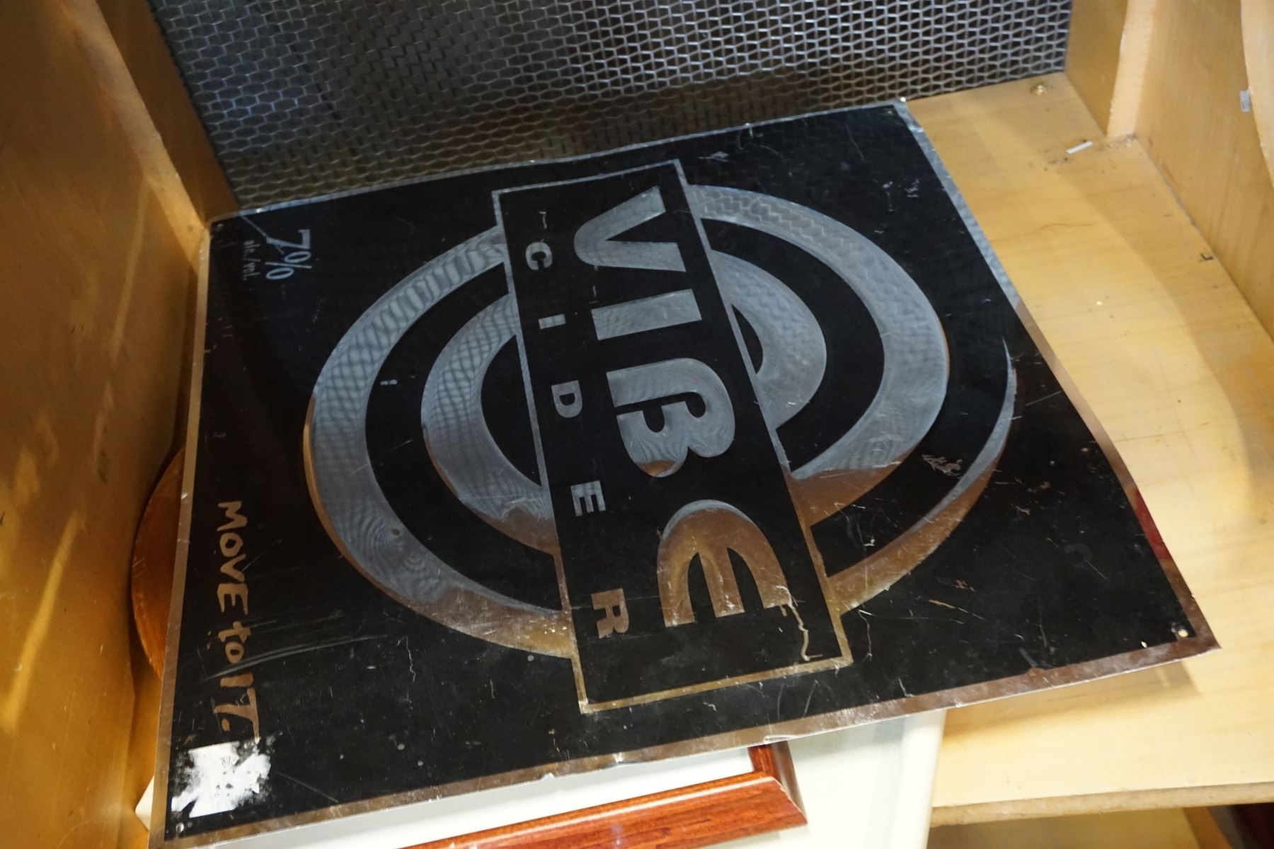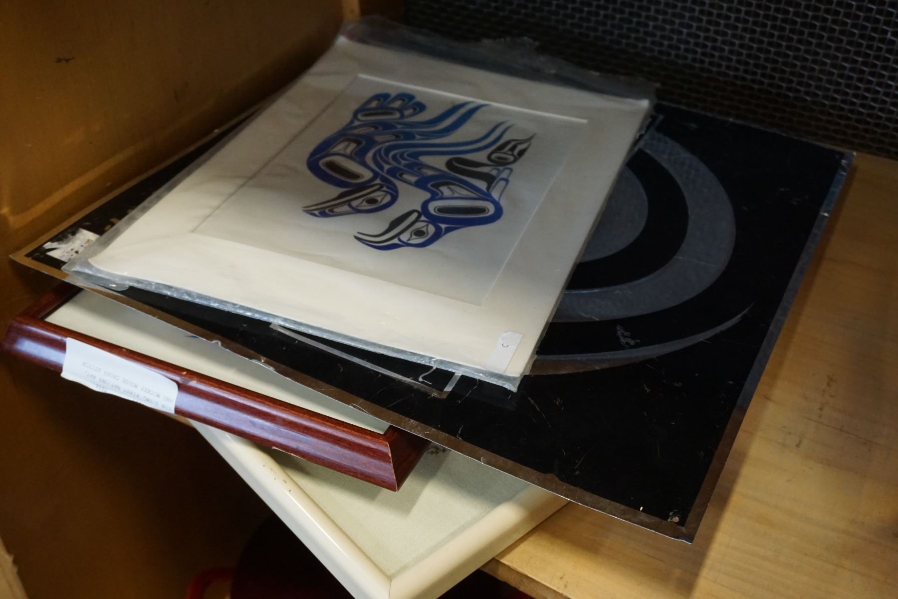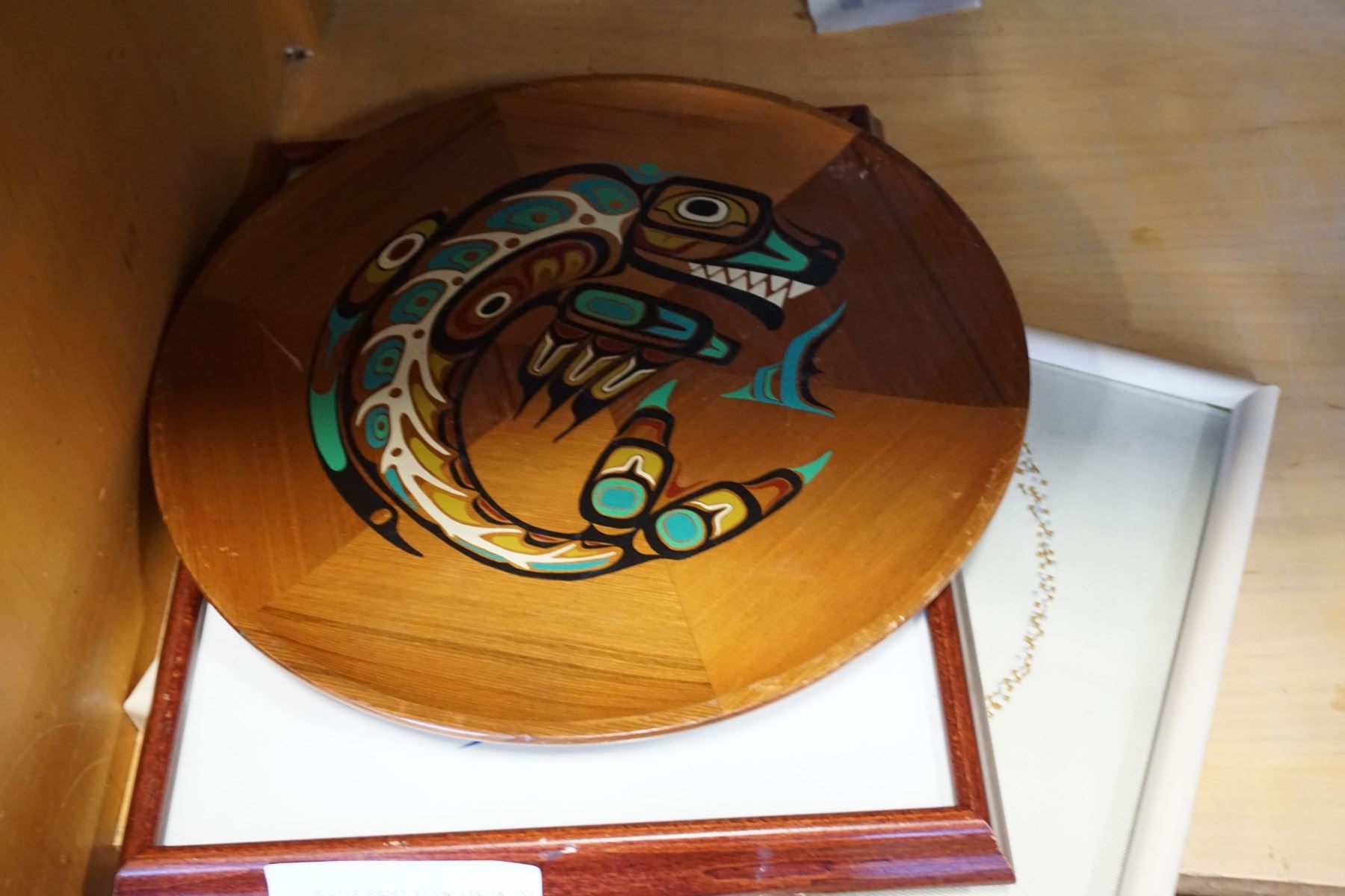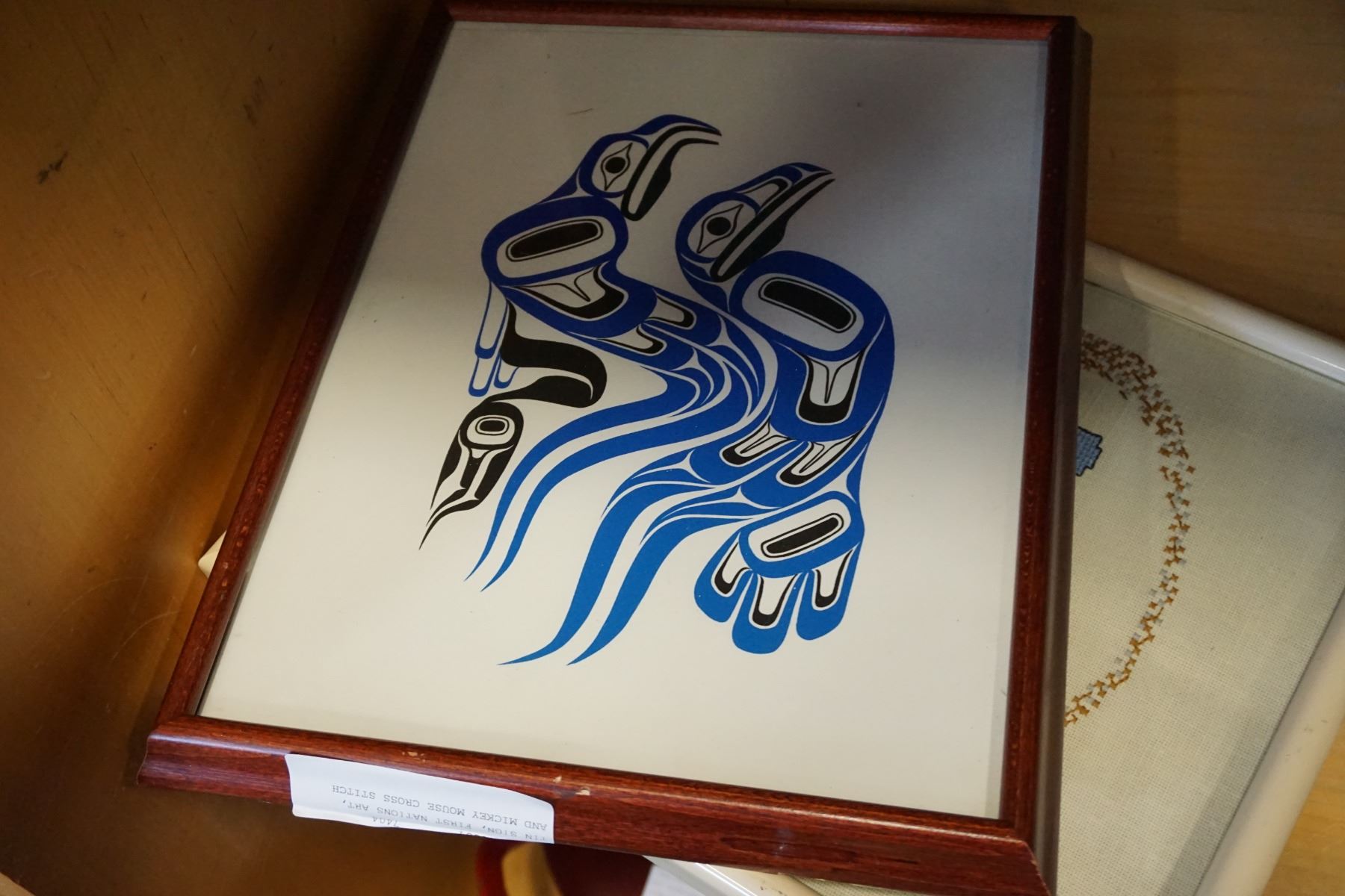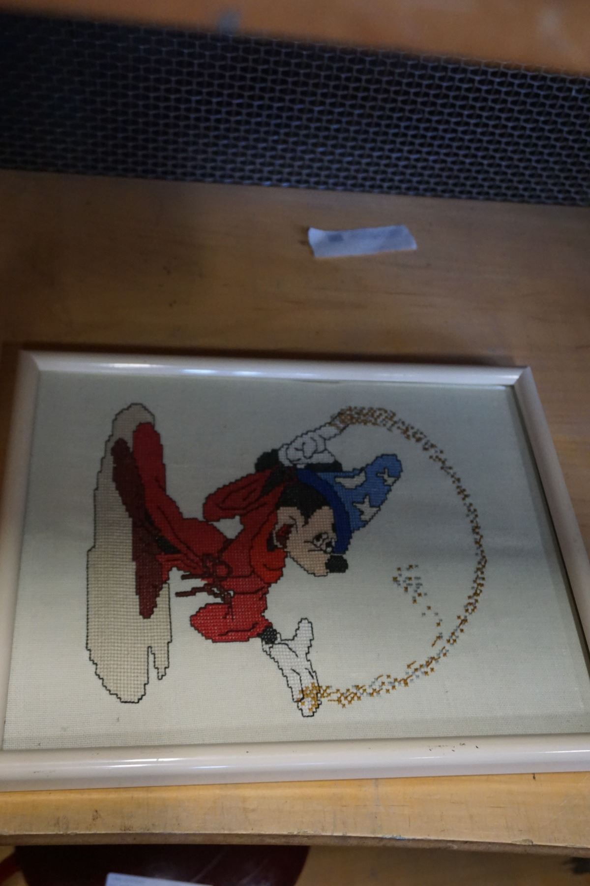 TIN SIGN, FIRST NATIONS ART, AND MICKEY MOUSE CROSS STITCH