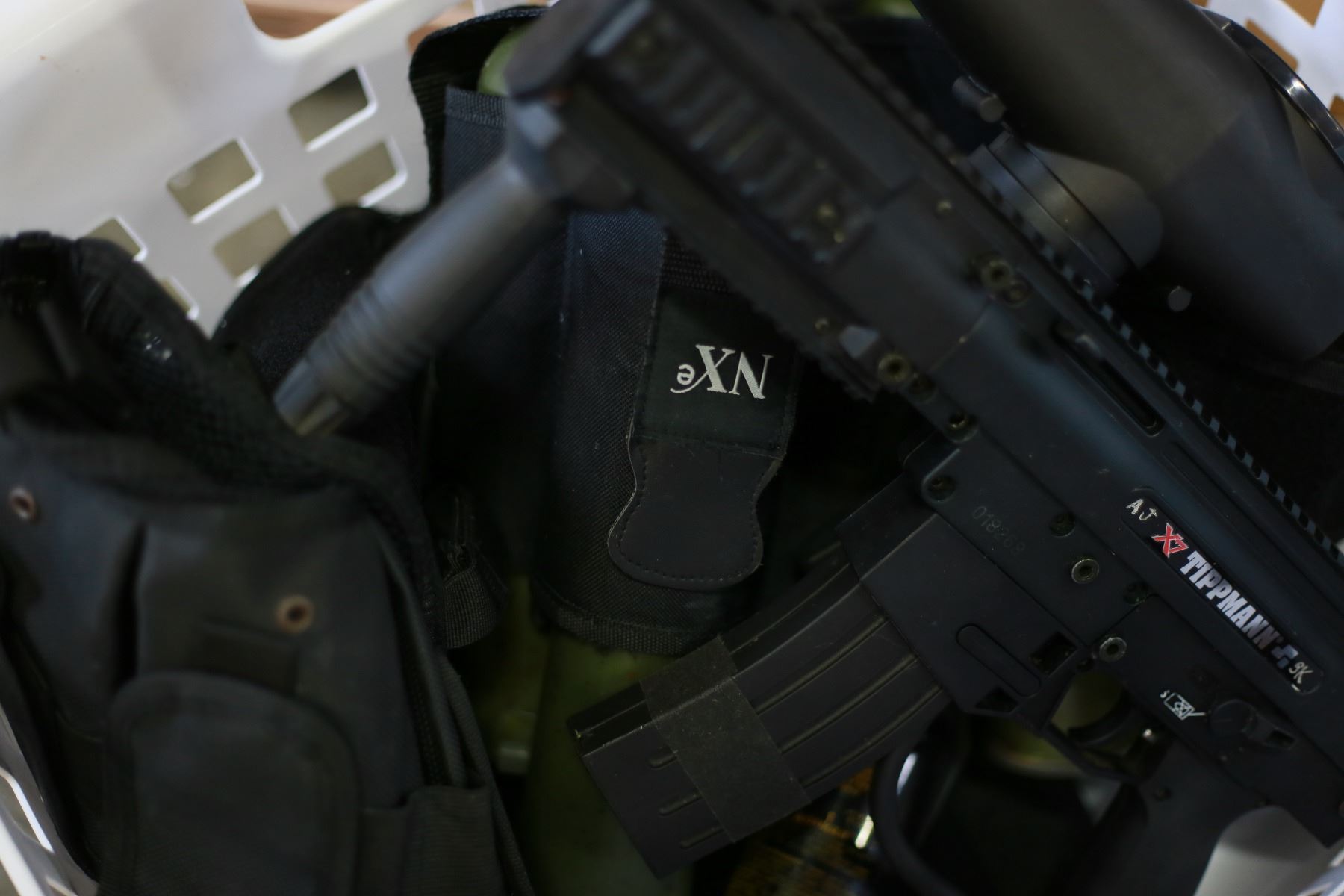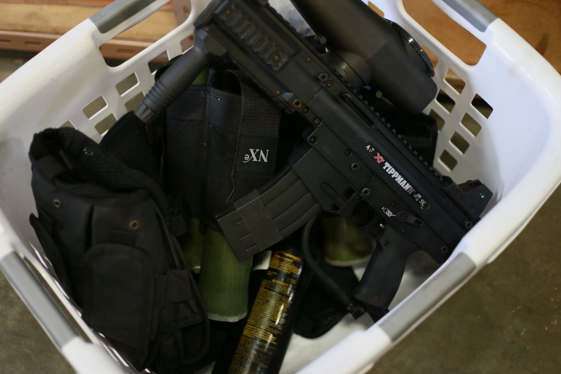 TIPMAN X7 PAINTBALL GUN WITH 3 AIR BOTTLES VEST WITH RELOAD TUBES AND AIR HOSE