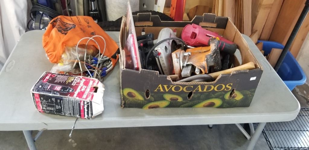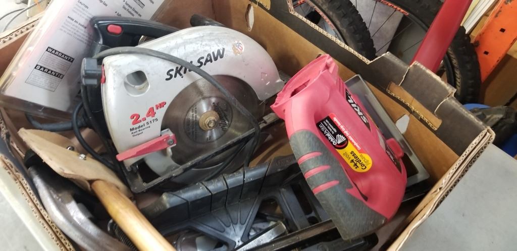 TIRE CHAINS, HYDRAULIC JACK AND BOX OF ASSORTED TOOLS