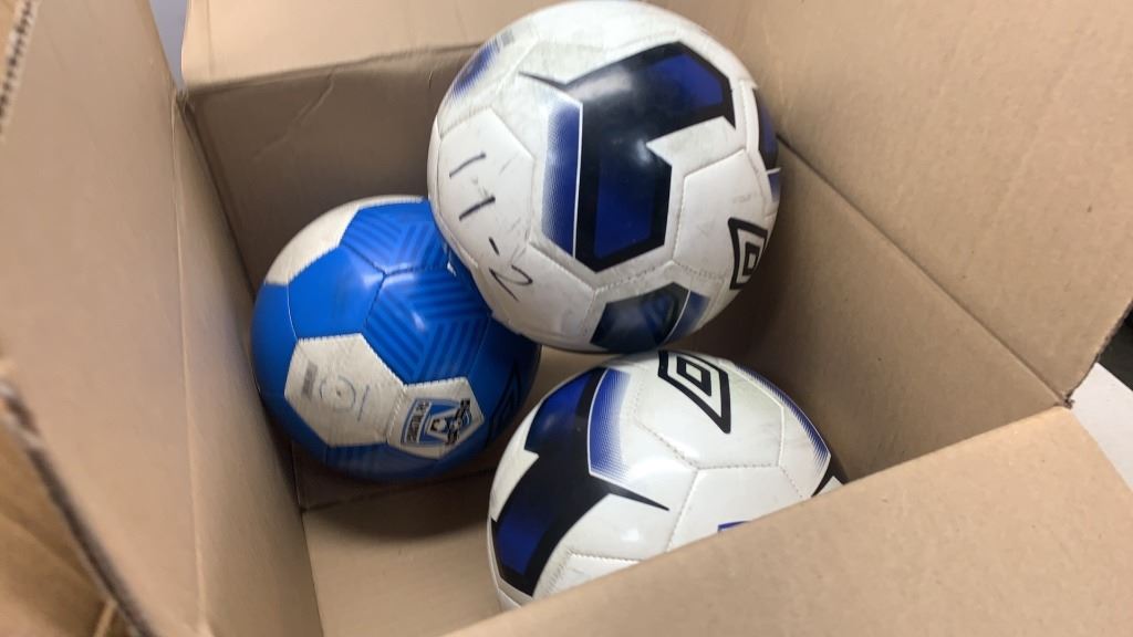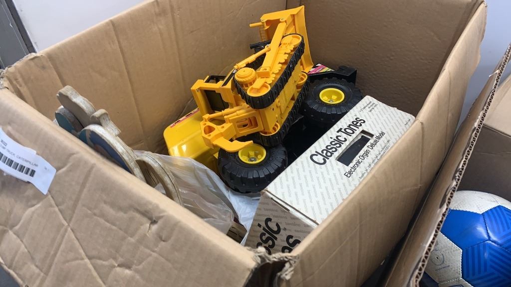 TONKA DUMP TRUCK, CATERPILLAR BULLDOZER, KIDS ELECTRIC ORGAN AND VINTAGE KIDS ART CUTOUTS AND SOCCER BALLS