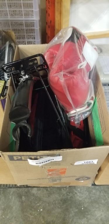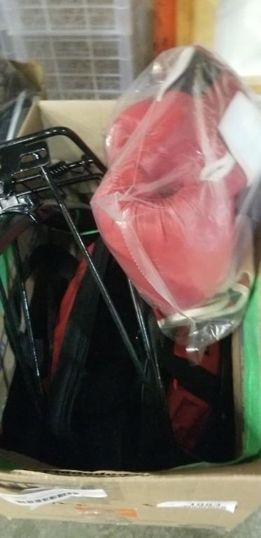 TOOL BAG WITH ASSORTED BIKE REPAIR TOOLS, BIKE RACK AND FENDER, AND BOXING GLOVES