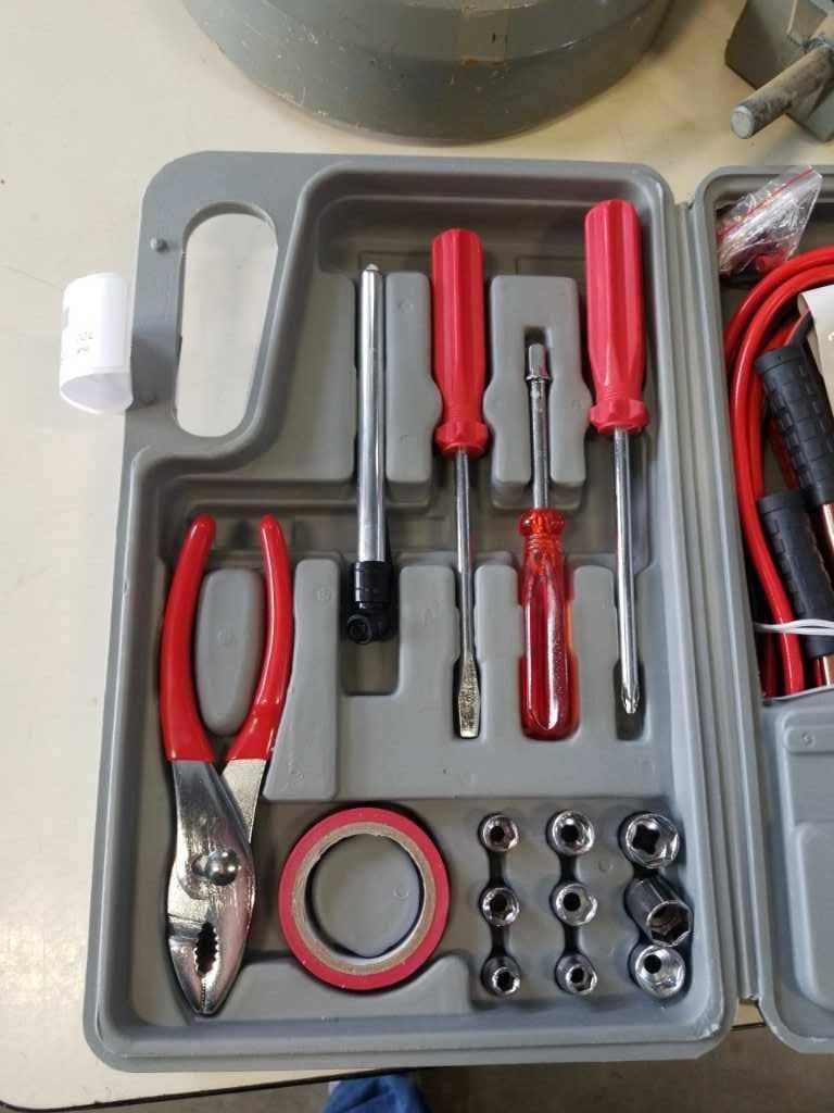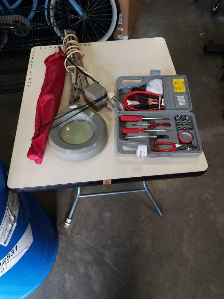 TOOL KIT, MAGNIFYING LAMP AND FOLDING STOOL