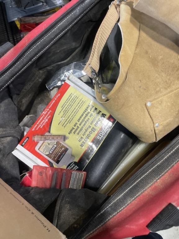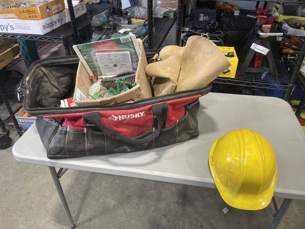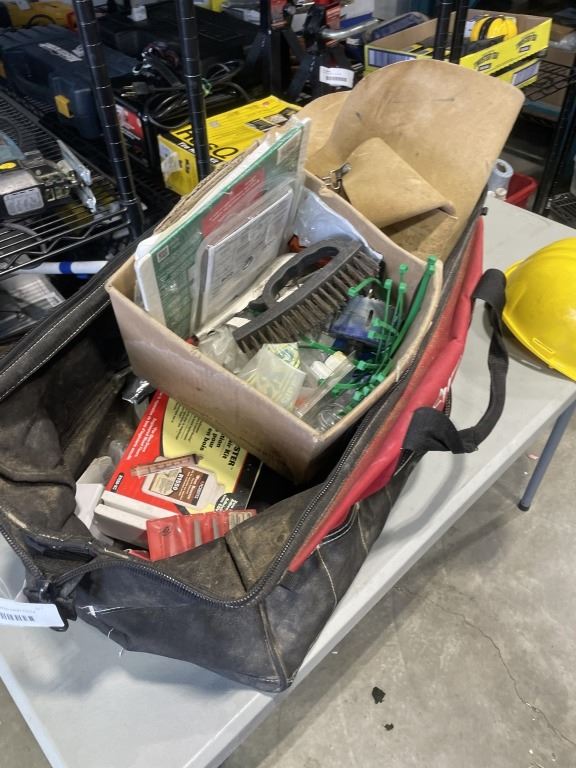 TOOL TOTE OF ASSORTED HAND TOOLS AND SHOP SUPPLY