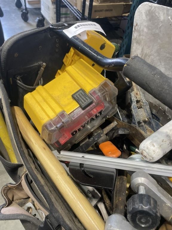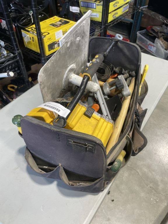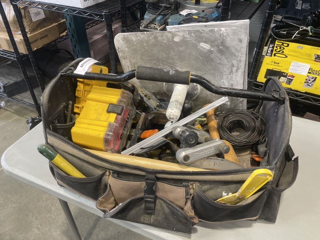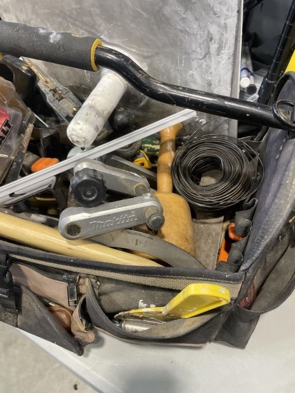 TOOL TOTE WITH ASSORTED HAND TOOLS AND STILETTO HAMMER HANDLE