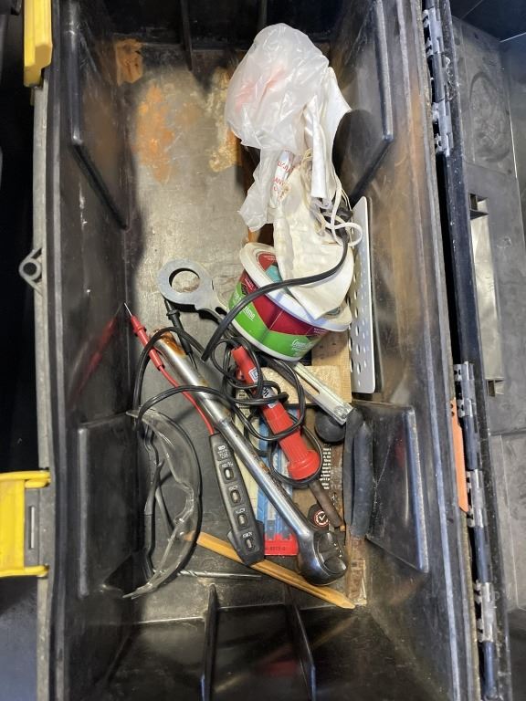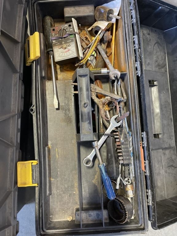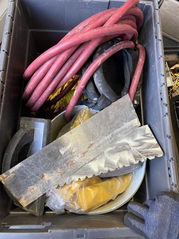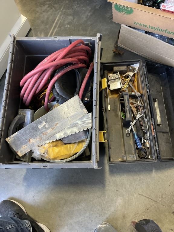 TOOLBOX AND CONTENTS AND TOTE OF ASSORTED TROWELS, AIR HOSE ETC