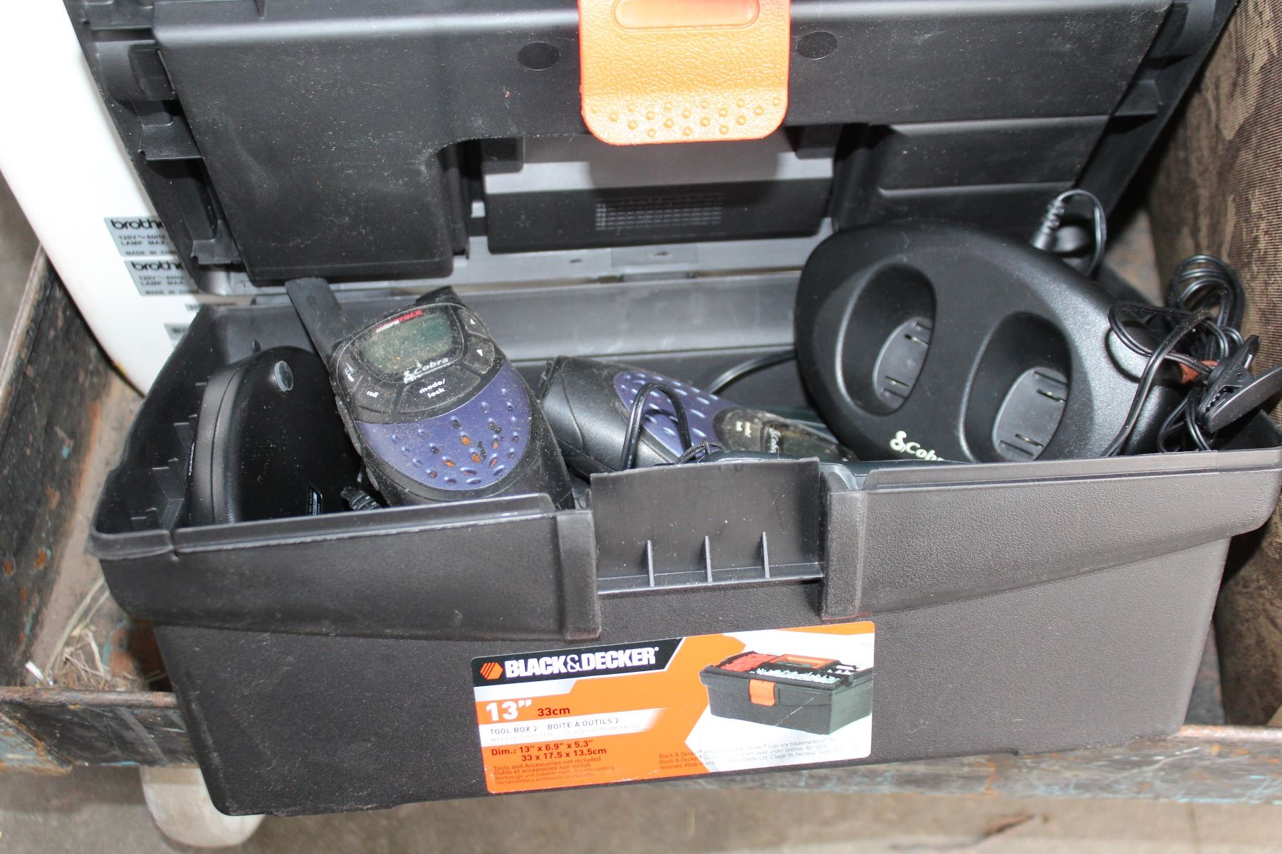 TOOLBOX WITH COBRA WALKIE TALKIES AND BATTERIES AND CHARGERS