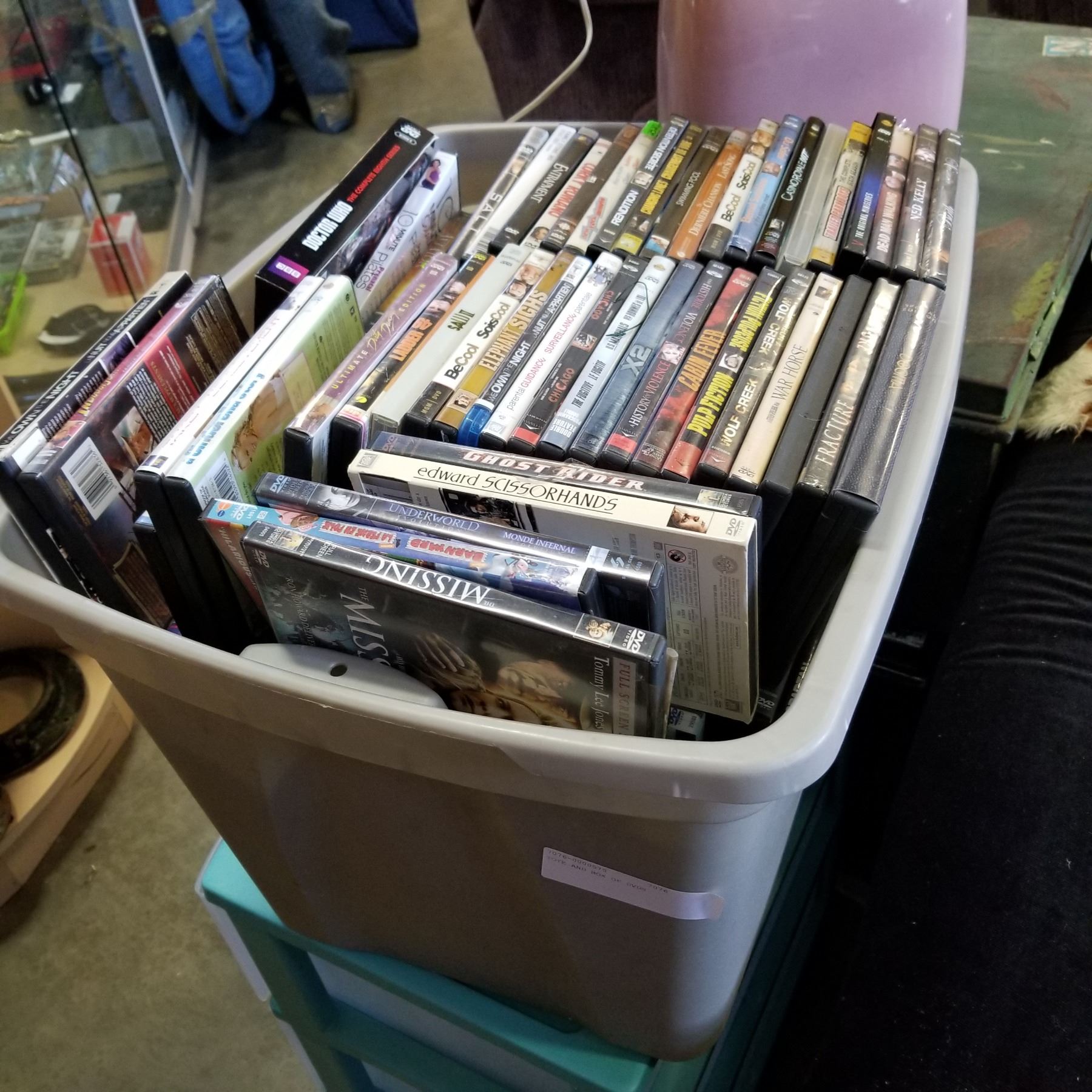 TOTE AND BOX OF DVDS