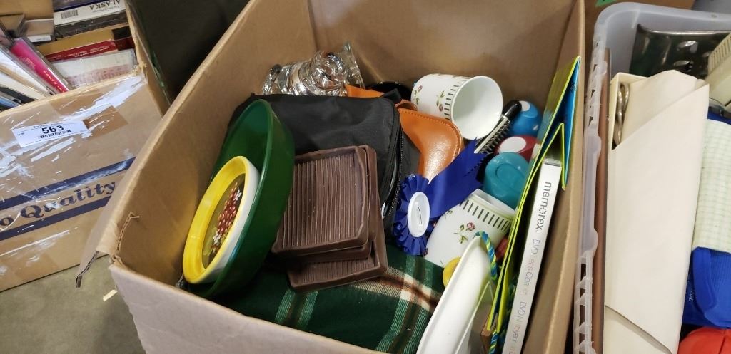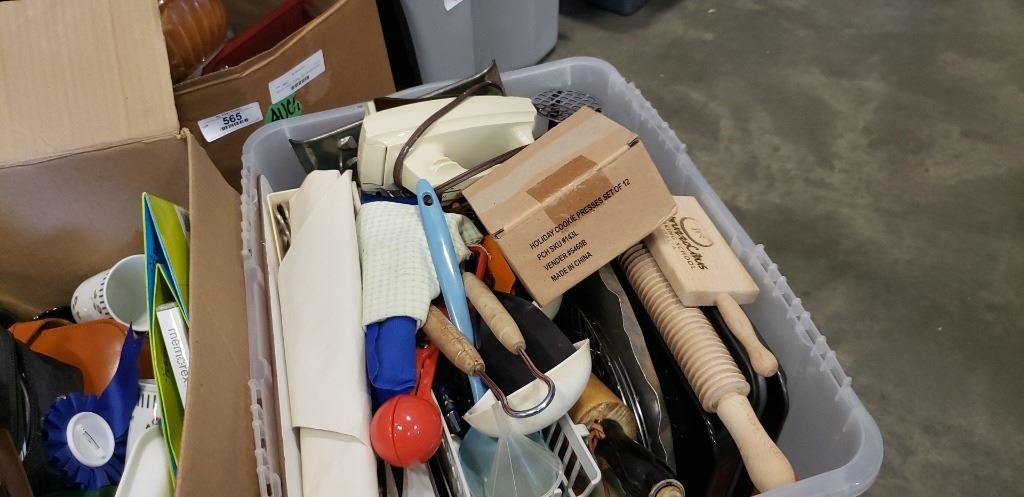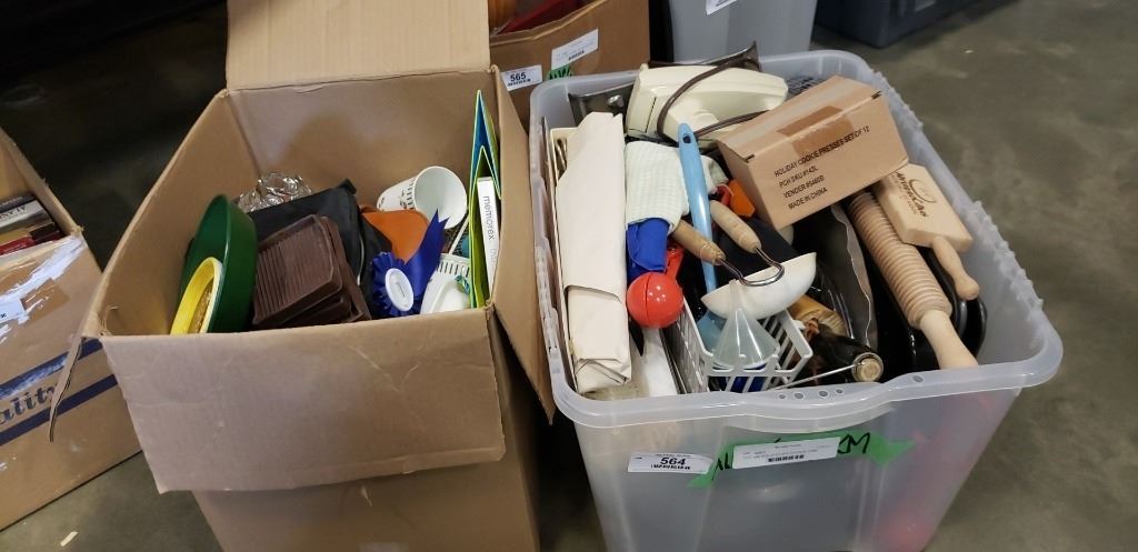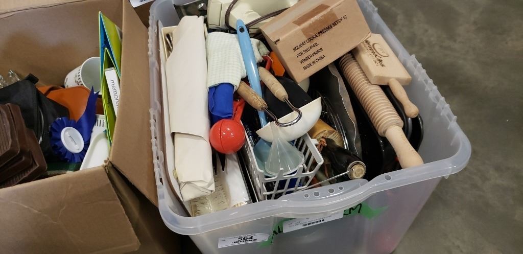 TOTE AND BOX OF ESTATE KITCHEN ITEMS