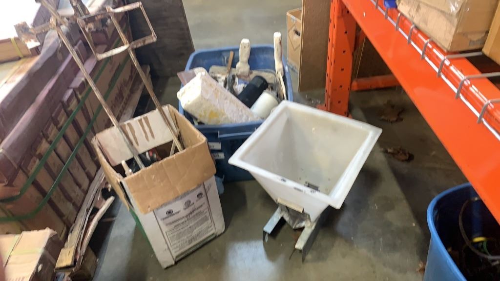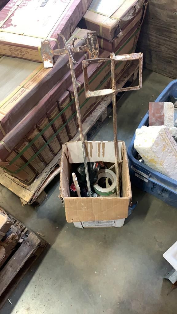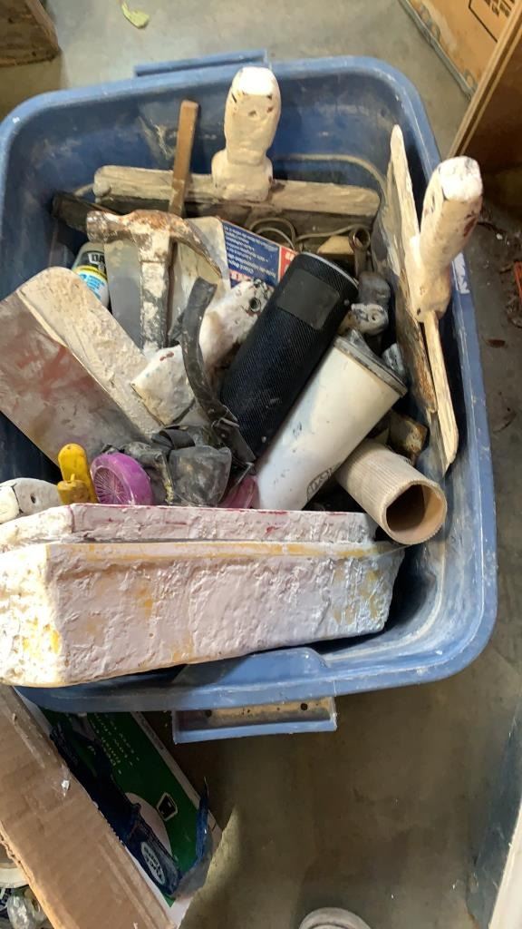 TOTE AND BOX OF PAINTING TOOLS, MIXING BITS