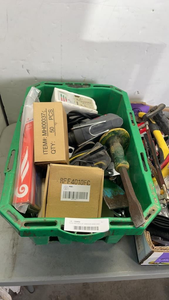 TOTE AND BOX OF VARIOUS HAND AND POWER TOOLS