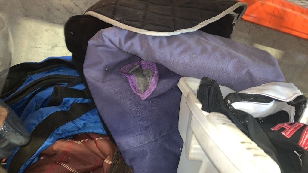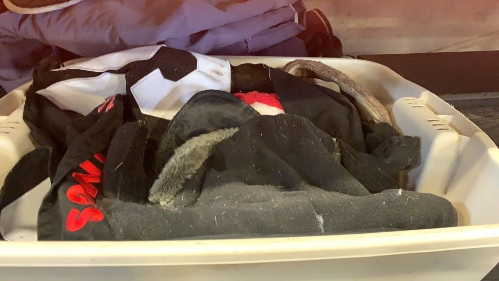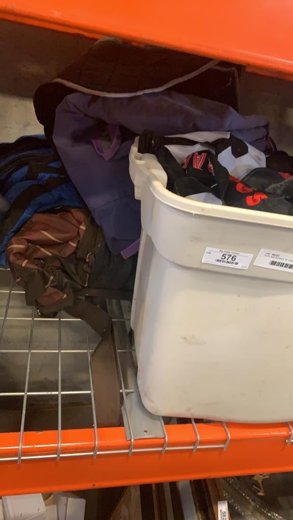 TOTE AND BUNDLE OF HORSE TACK, BRIDLES, HALTERS, BLANKETS