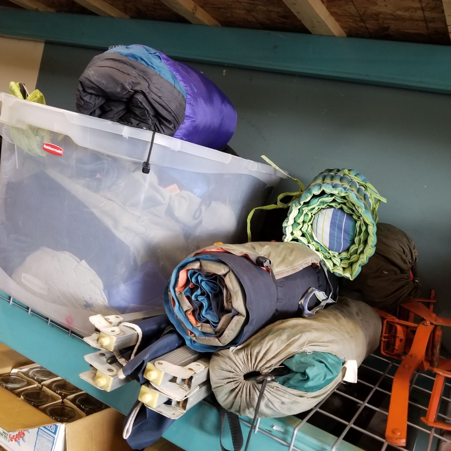 TOTE AND LARGE LOT OF CAMP ITEMS, TENTS, COT, SLEEPING BAG, ETC