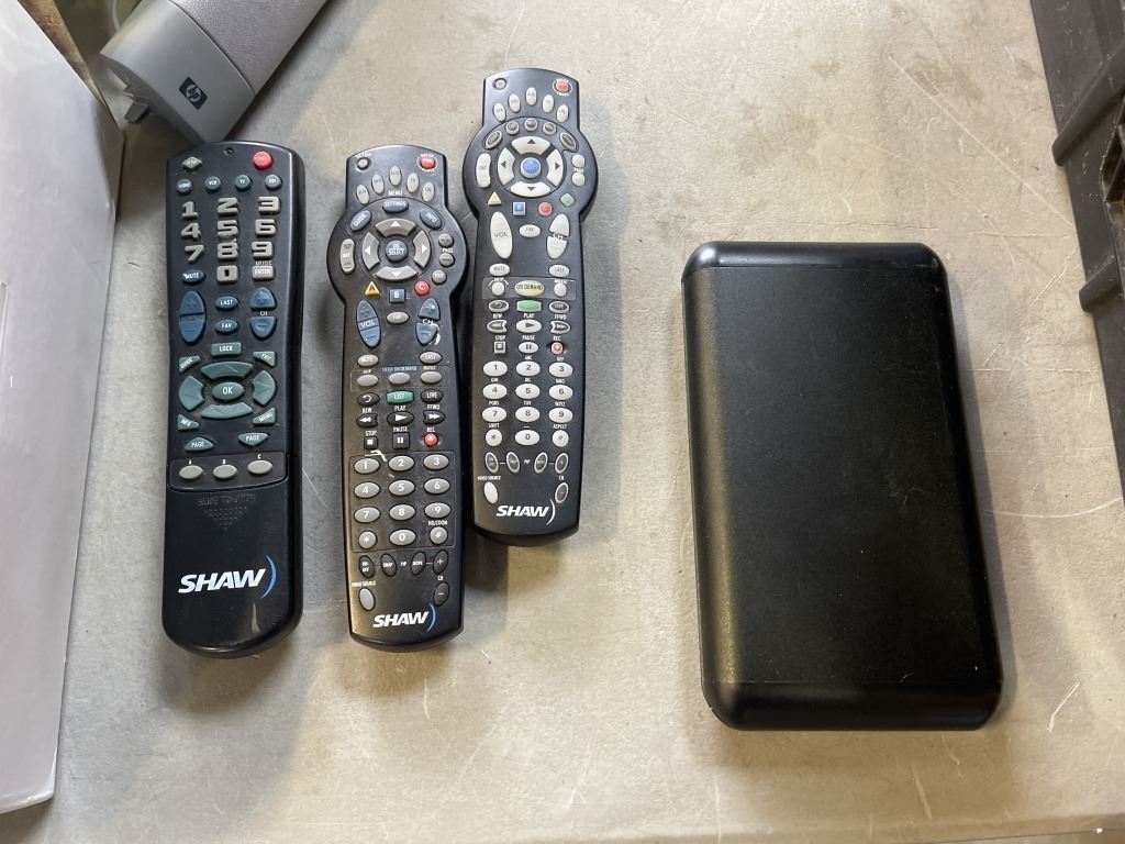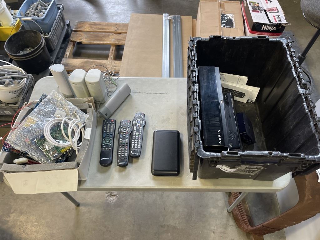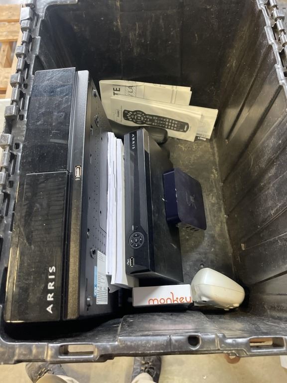 TOTE OF ASSORTED ELECTRONICS INCLUDING EXTERNAL HARD DRIVE AND MORE