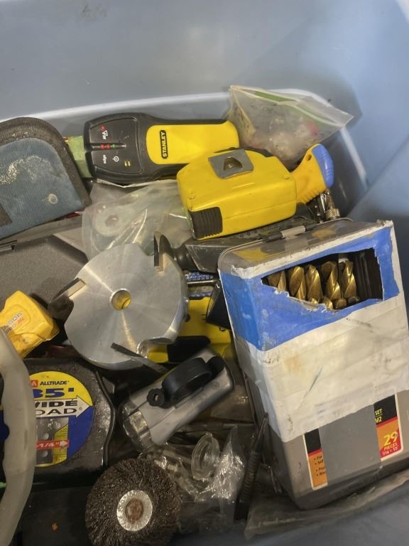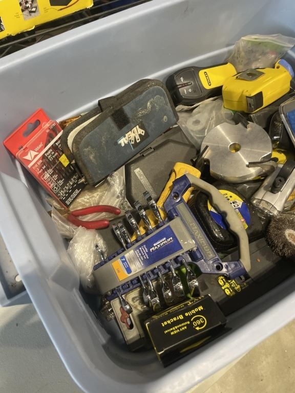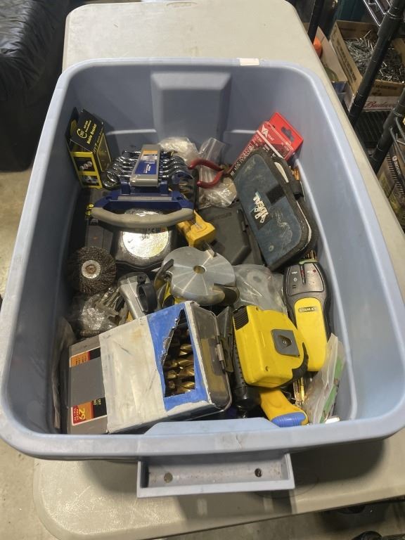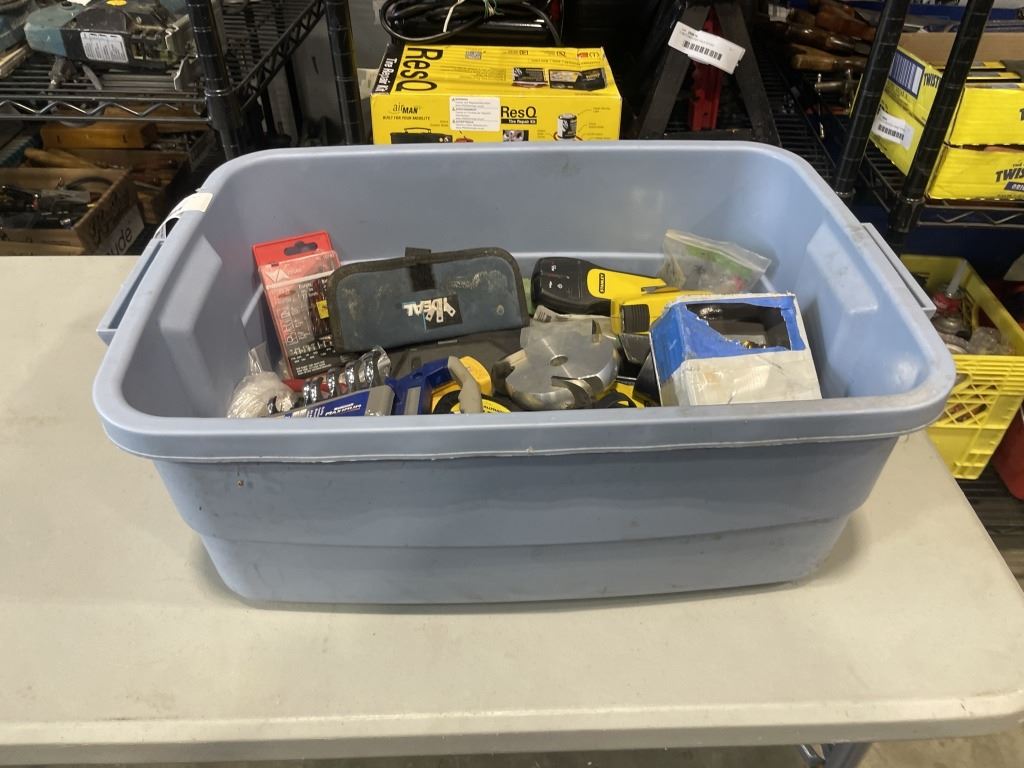 TOTE OF ASSORTED HAND TOOLS AND SHOP SUPPLY