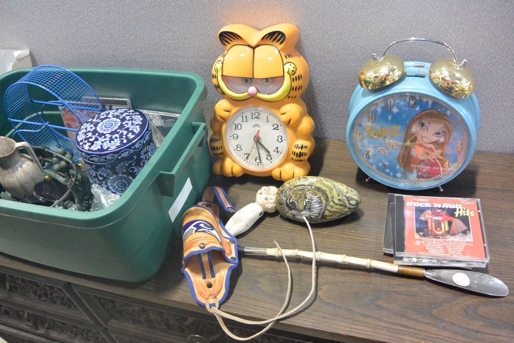 TOTE OF ASSORTED NOVELTY CLOCKS ETC