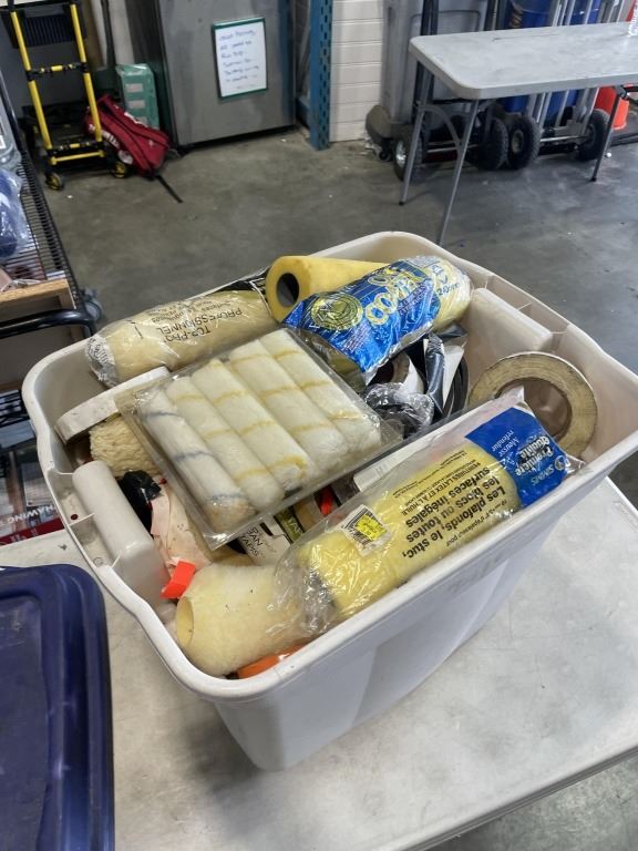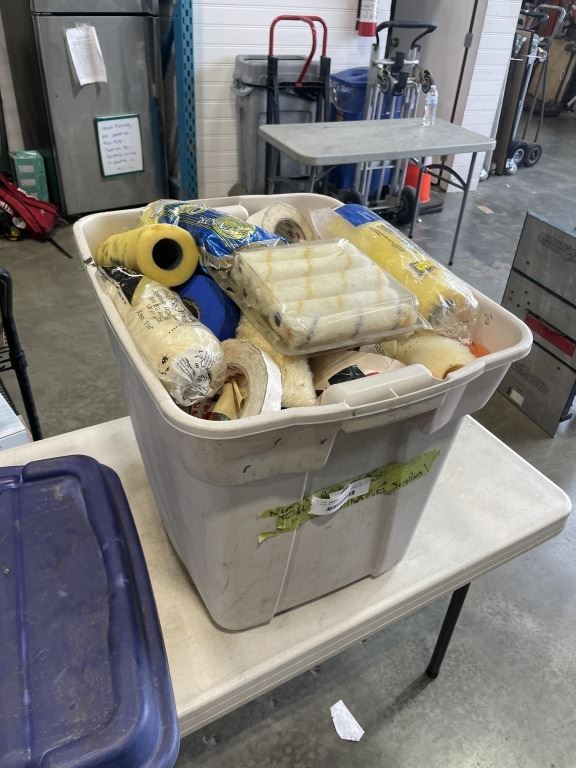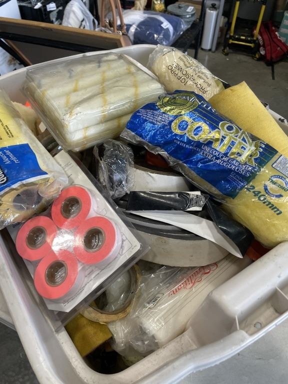 TOTE OF ASSORTED PAINTING SUPPLY AND ROLLERS