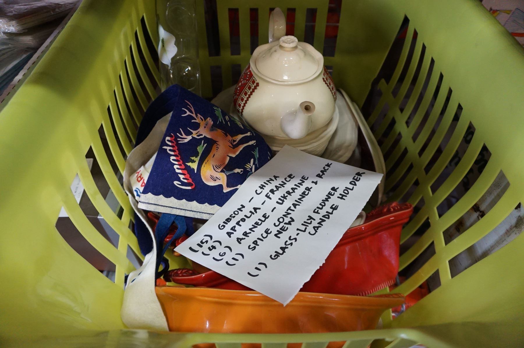 TOTE OF CHINA, TEA POT, AND VANCOUVER 1958 PENNANT