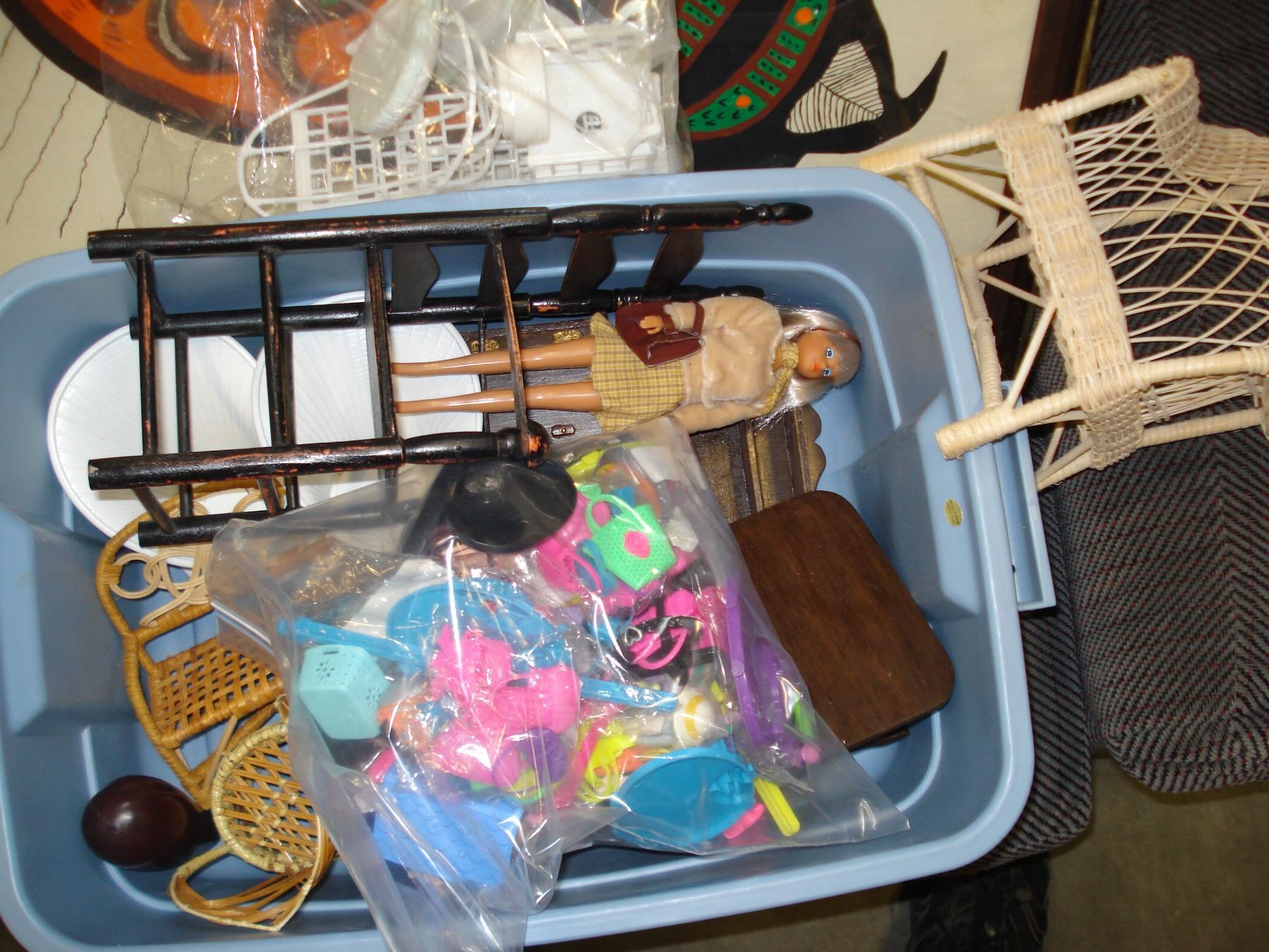 TOTE OF DOLL HOUSE AND DOLL FURNITURE
